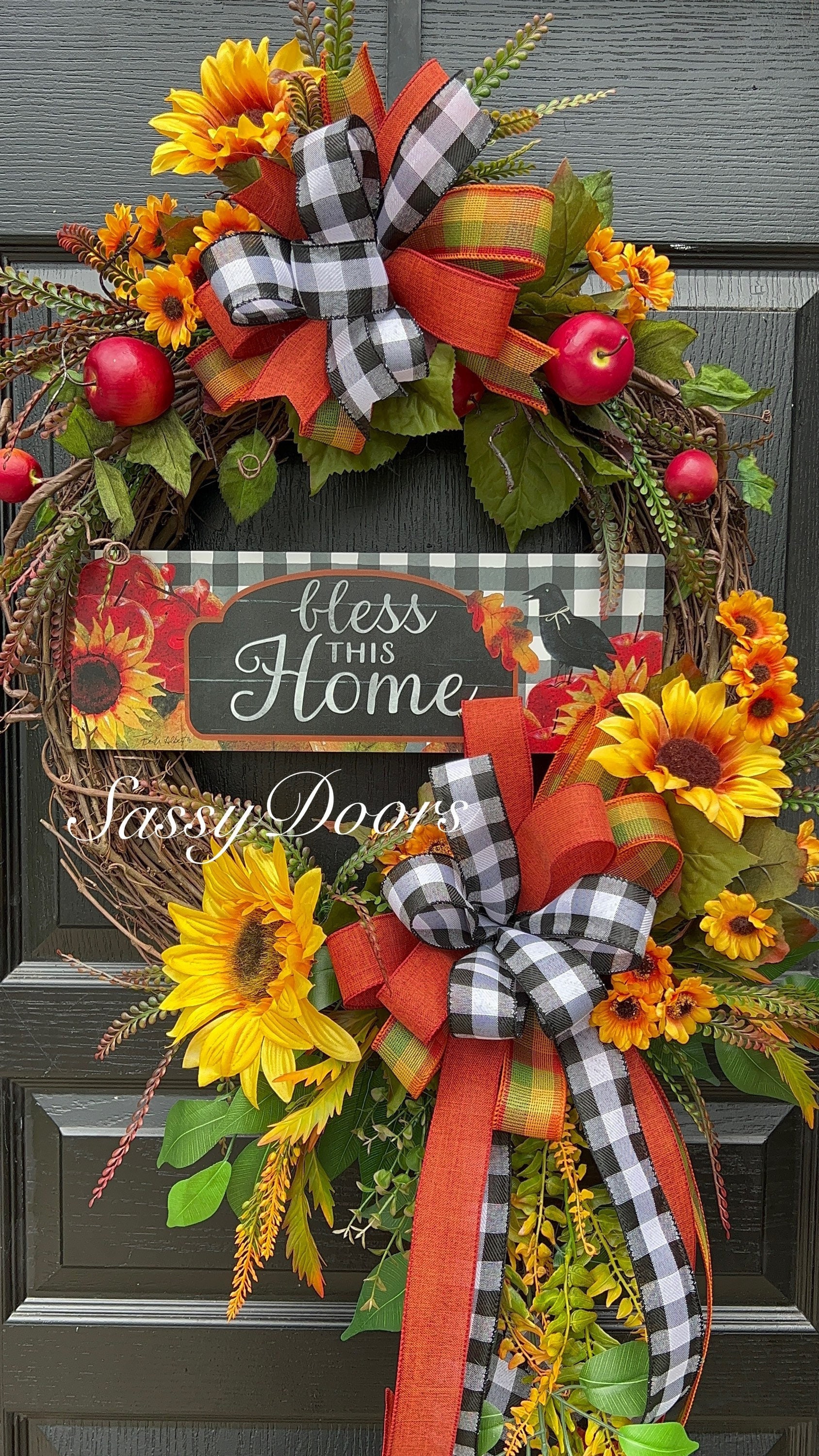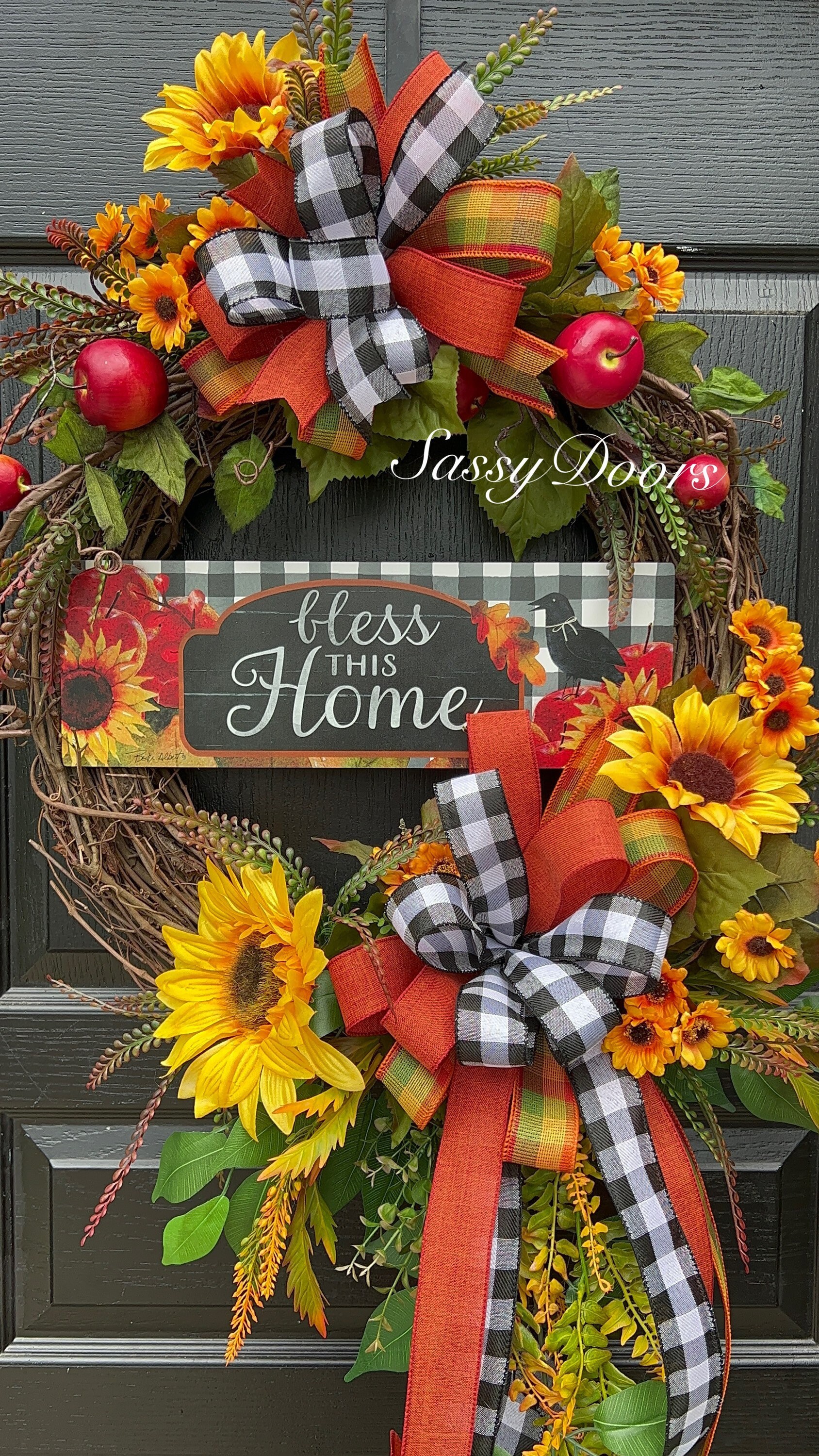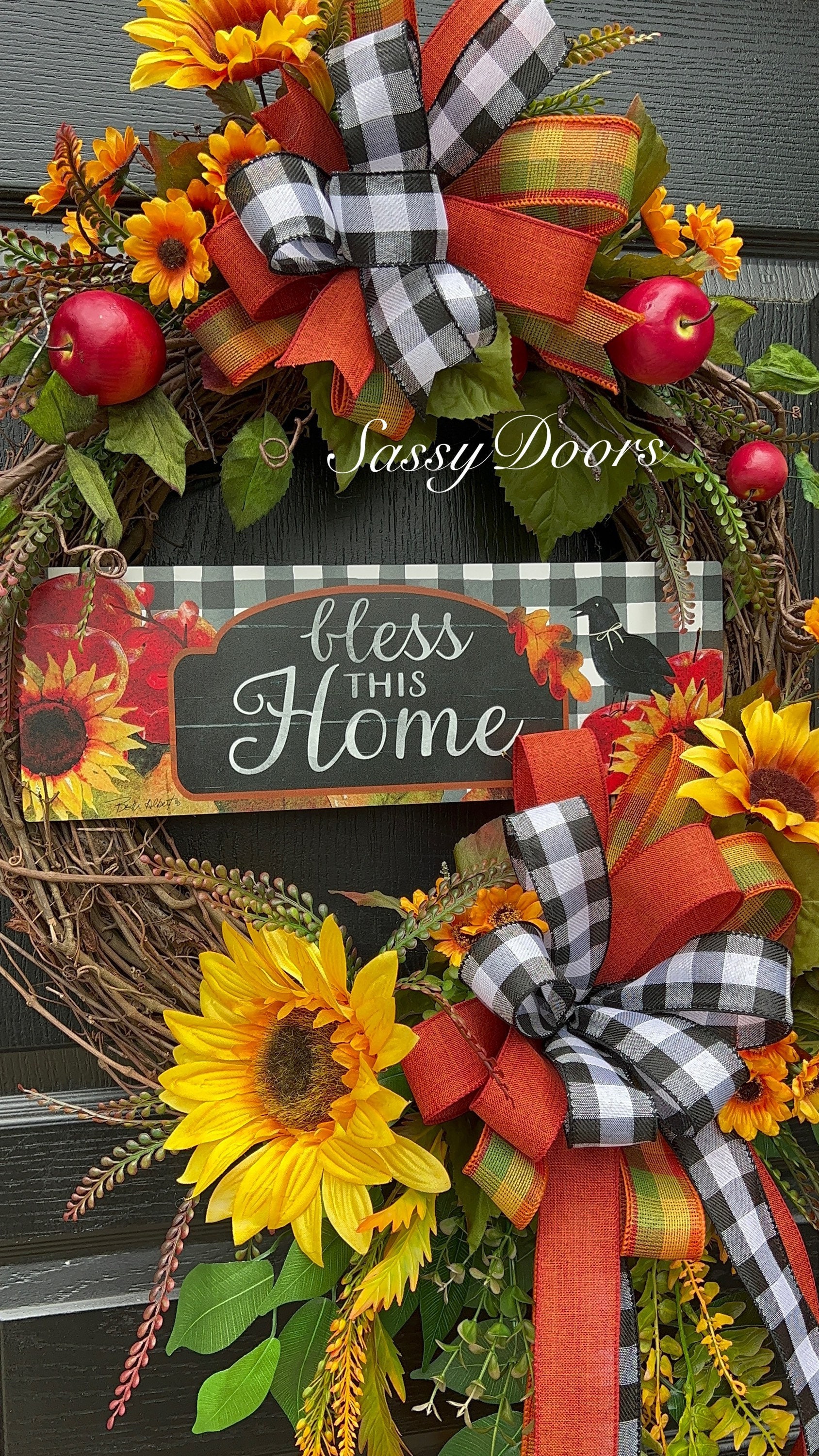Designed on a 18” grapevine, wreath accented apples, sunflowers, lots of fall greenery beautiful buffalo plaid ribbons and so much more.