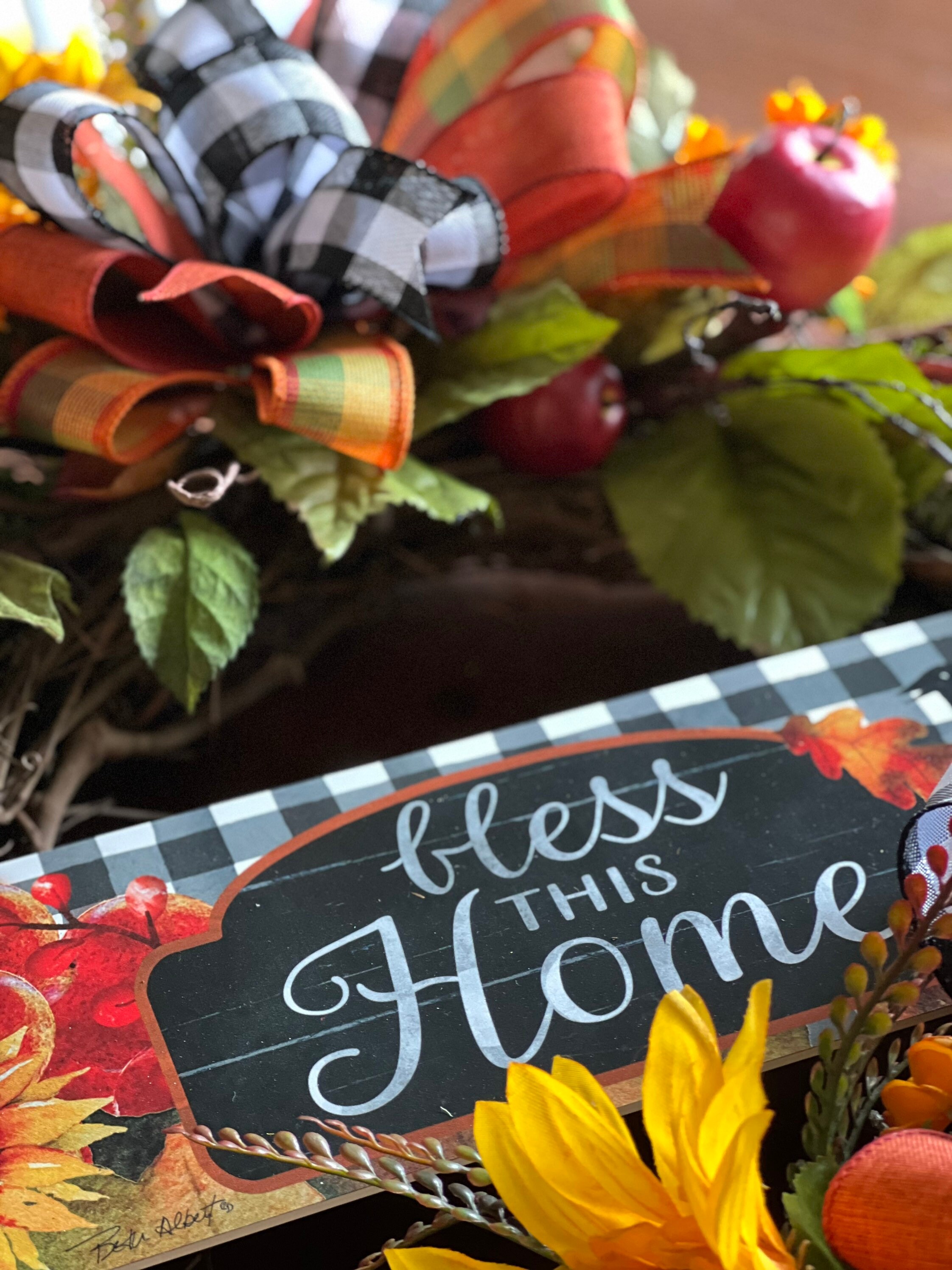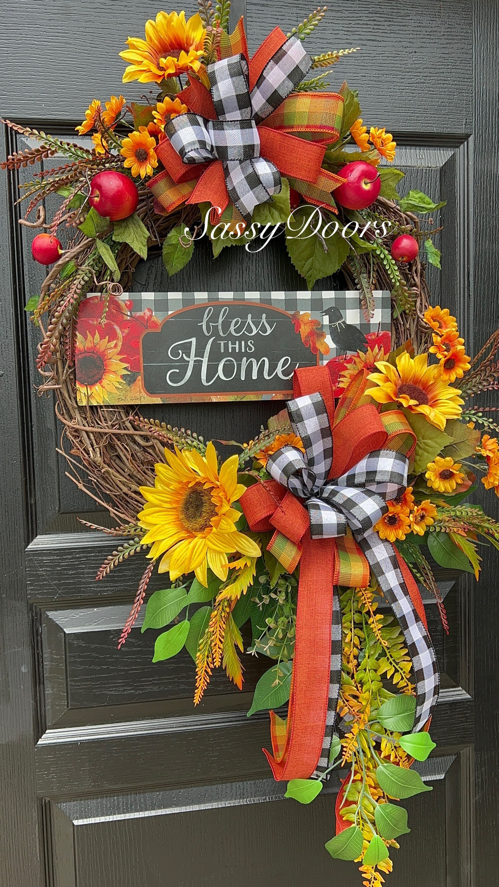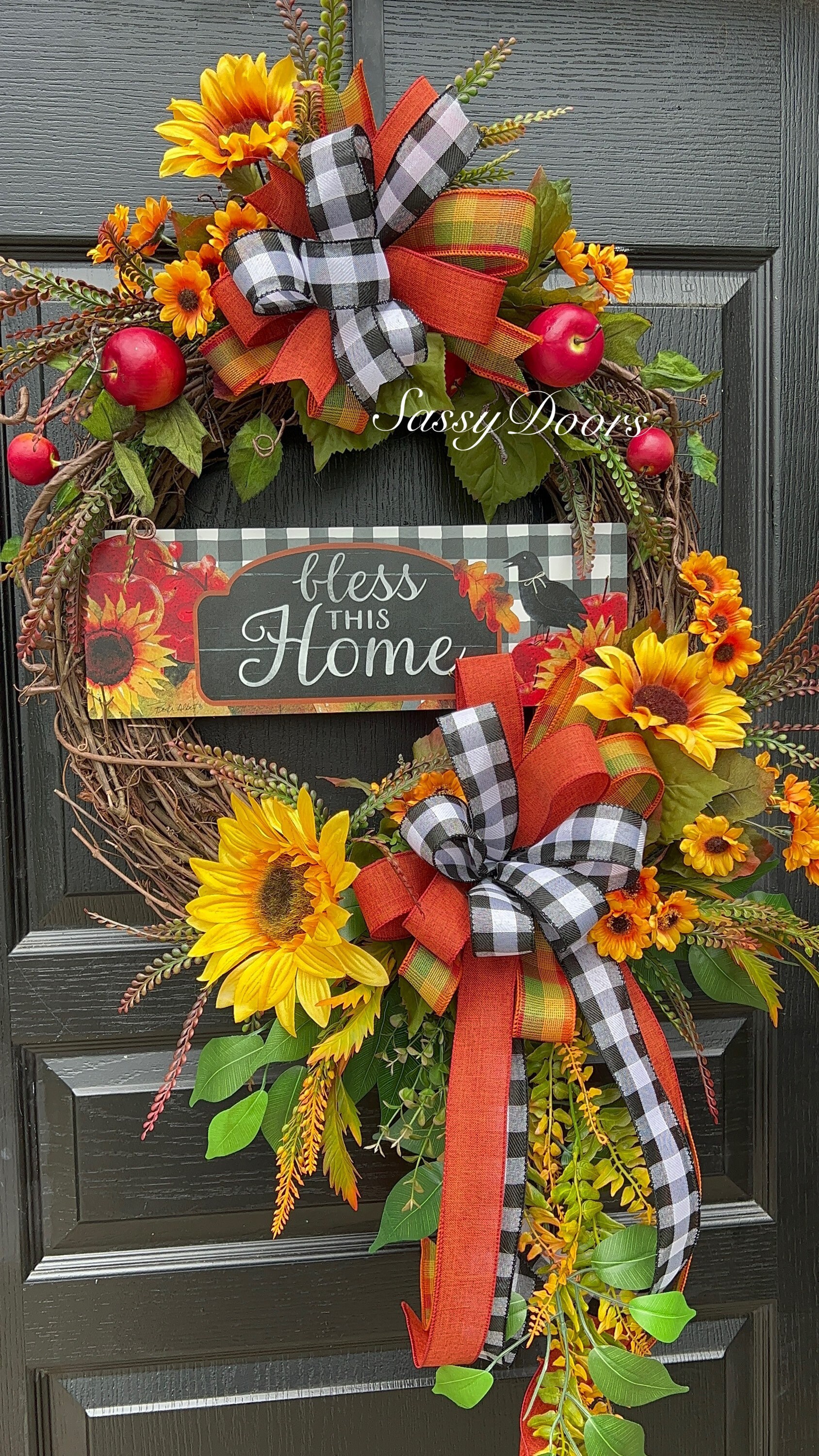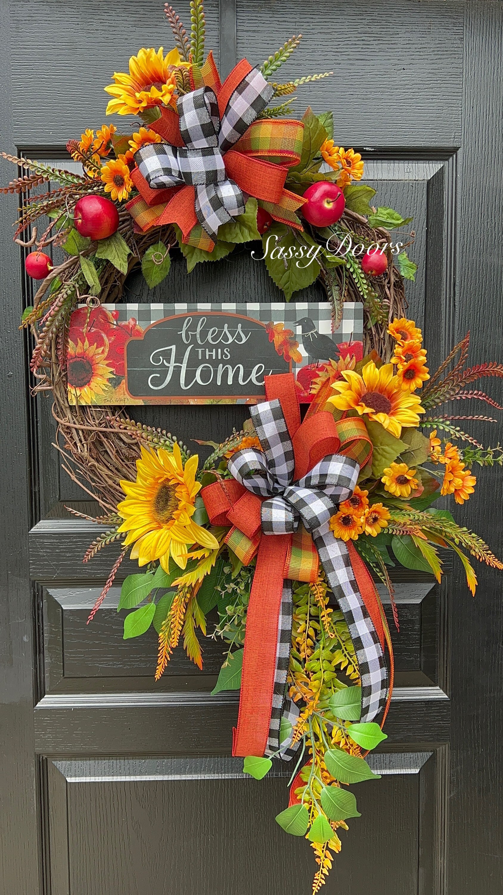 Designed on a 18” grapevine, wreath accented apples, sunflowers, lots of fall greenery beautiful buffalo plaid ribbons and so much more.