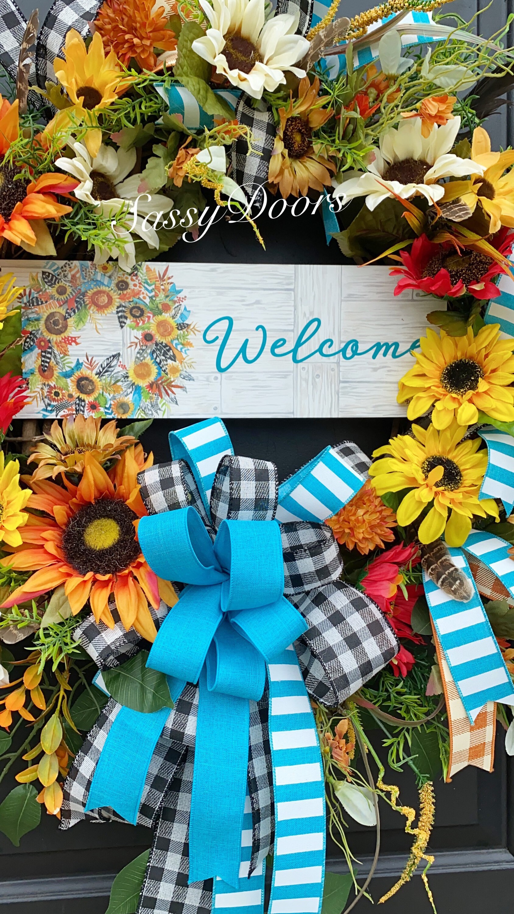 Designed on a grapevine wreath and absolutely loaded with sunflowers, grasses, ficus, feathers and so much more. It perfectly compliments the welcome sign.