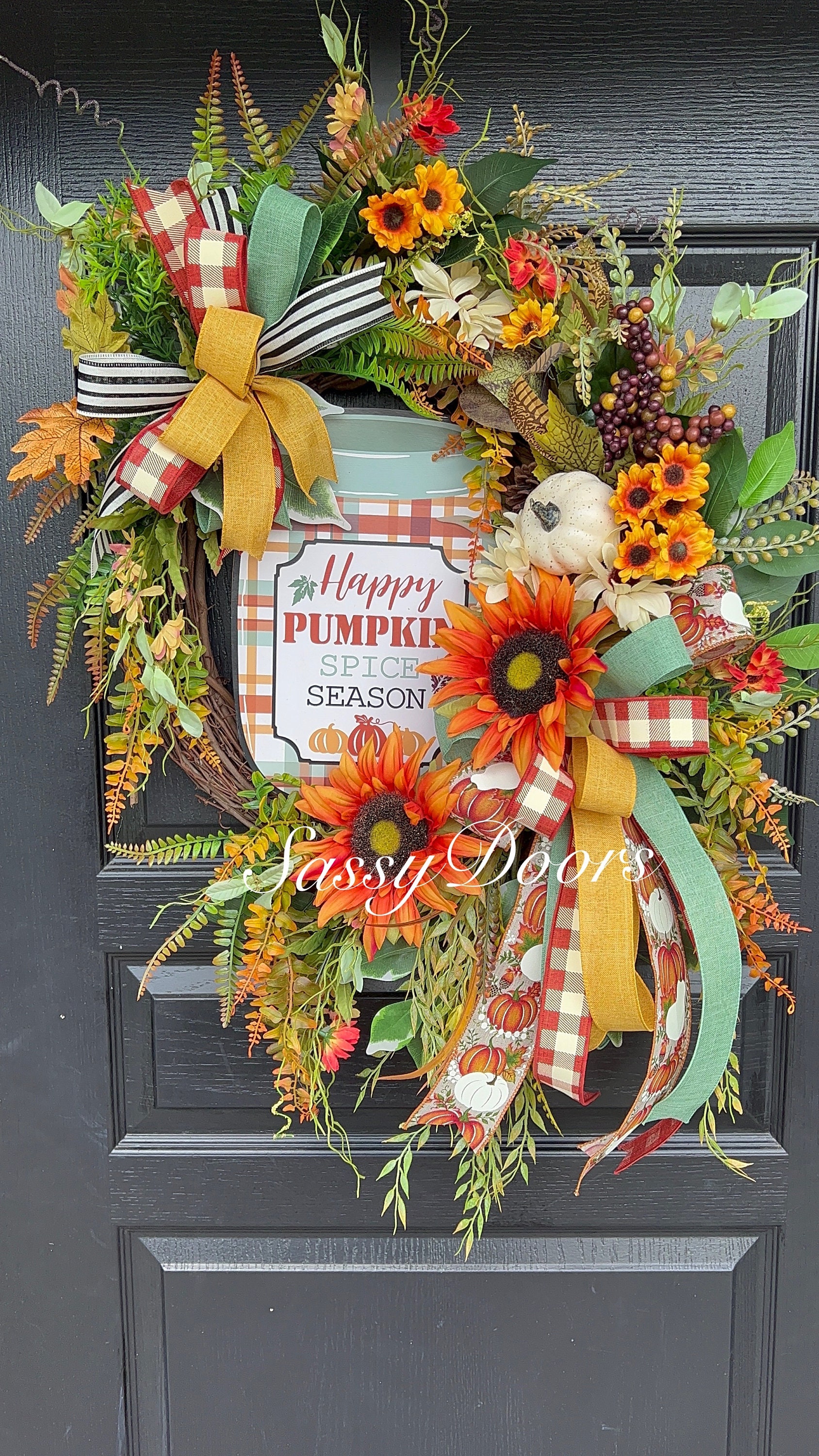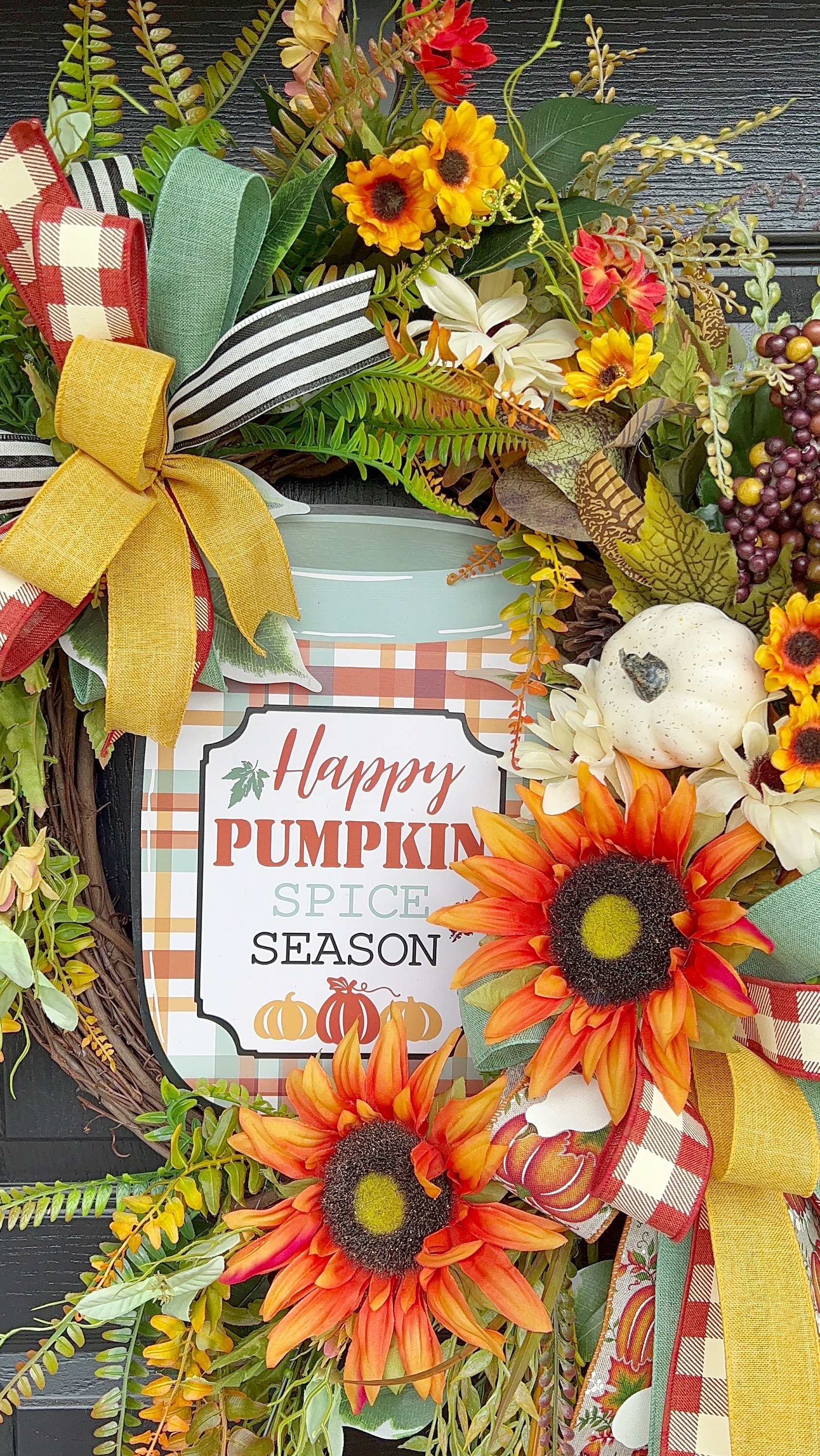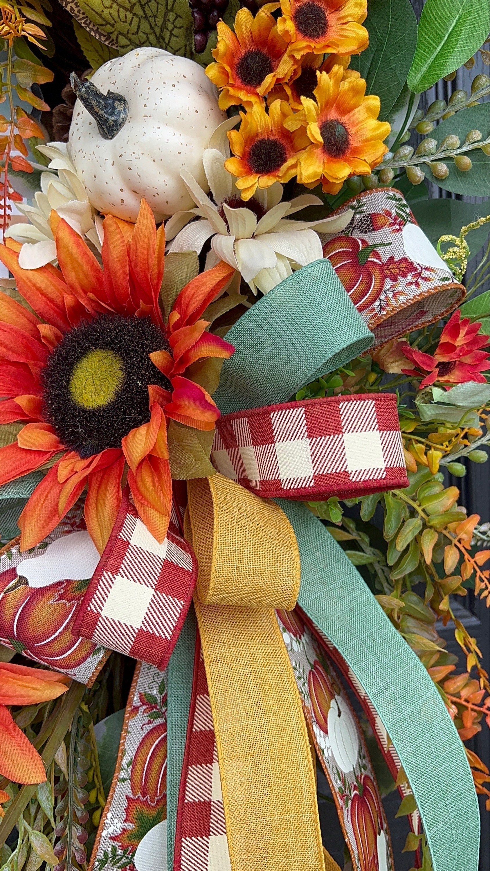 Designed on a 18” natural grapevine wreath and absolutely loaded with a variety of silk sunflowers, faux greenery such as grasses, ficus, ferns and so much more. It perfectly compliments the welcome sign.