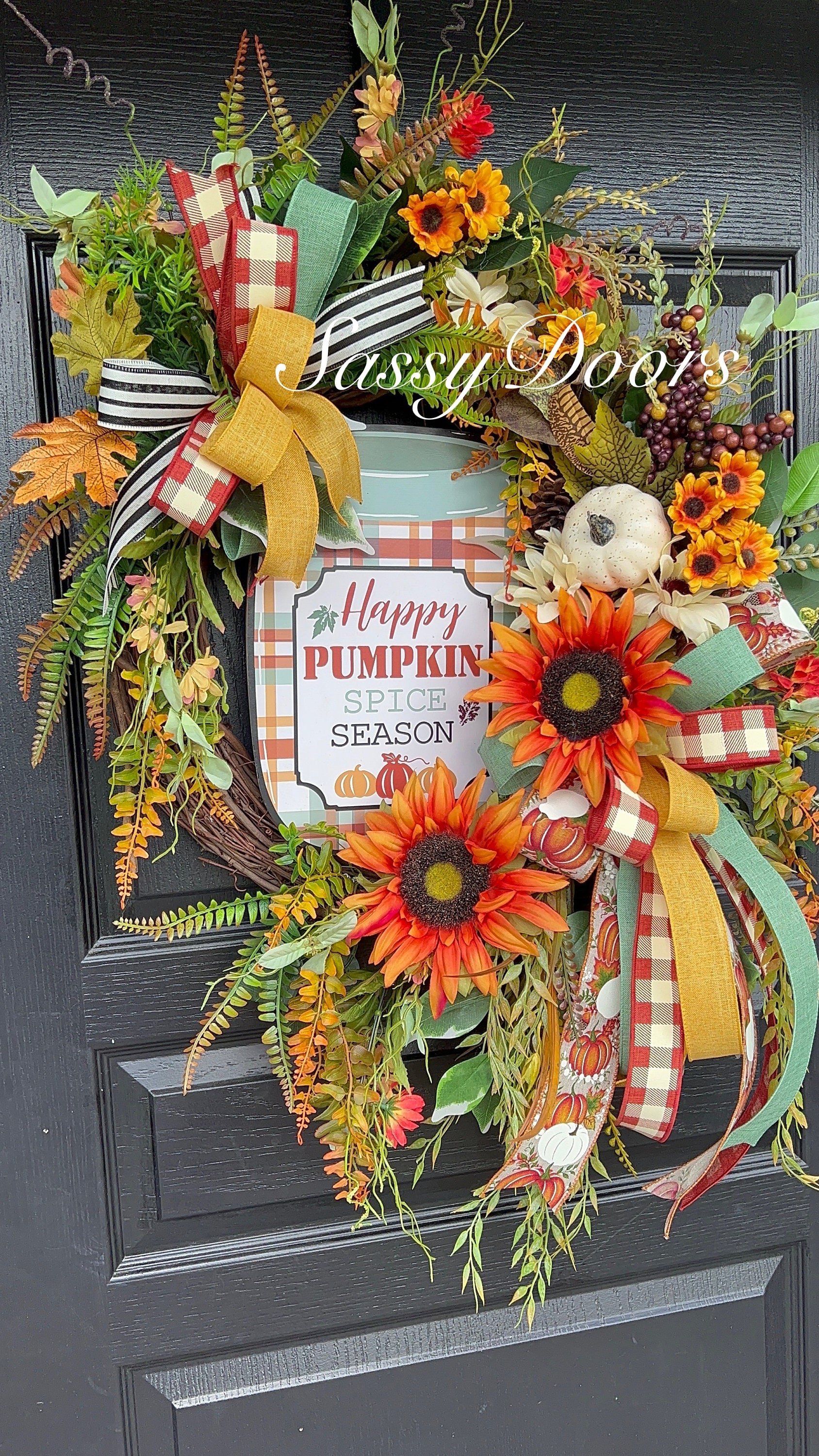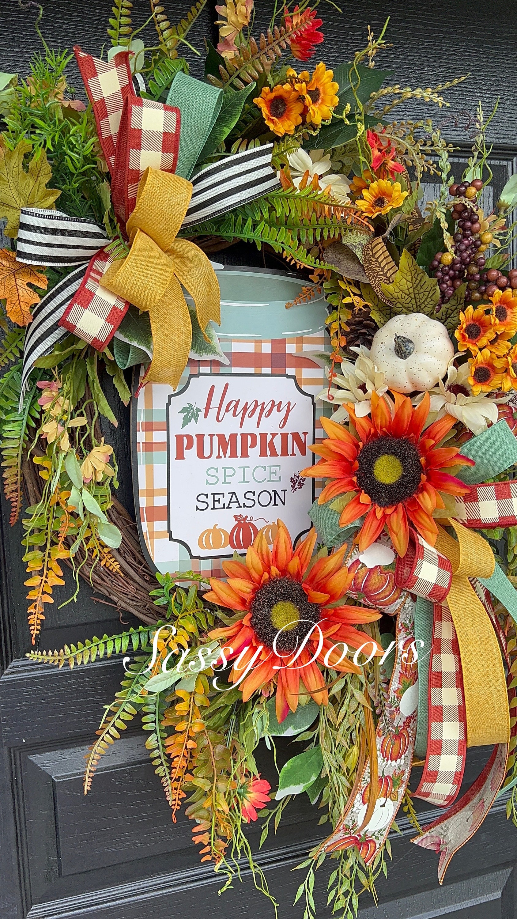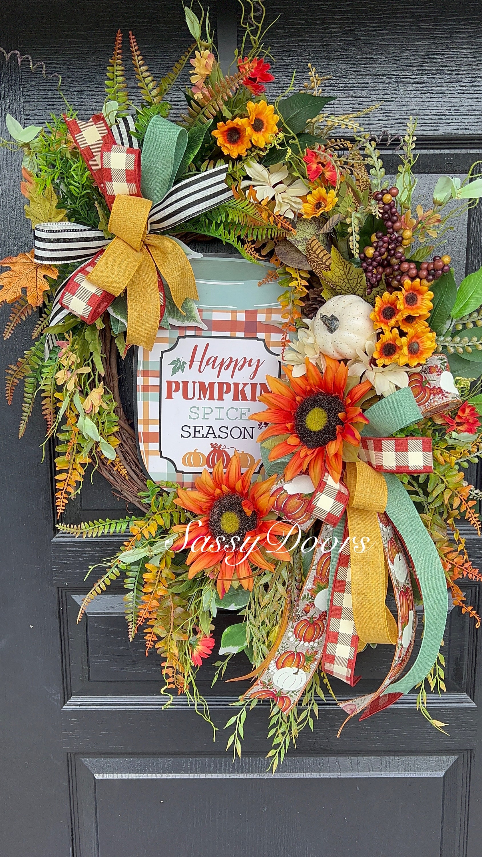 Designed on a 18” natural grapevine wreath and absolutely loaded with a variety of silk sunflowers, faux greenery such as grasses, ficus, ferns and so much more. It perfectly compliments the welcome sign.