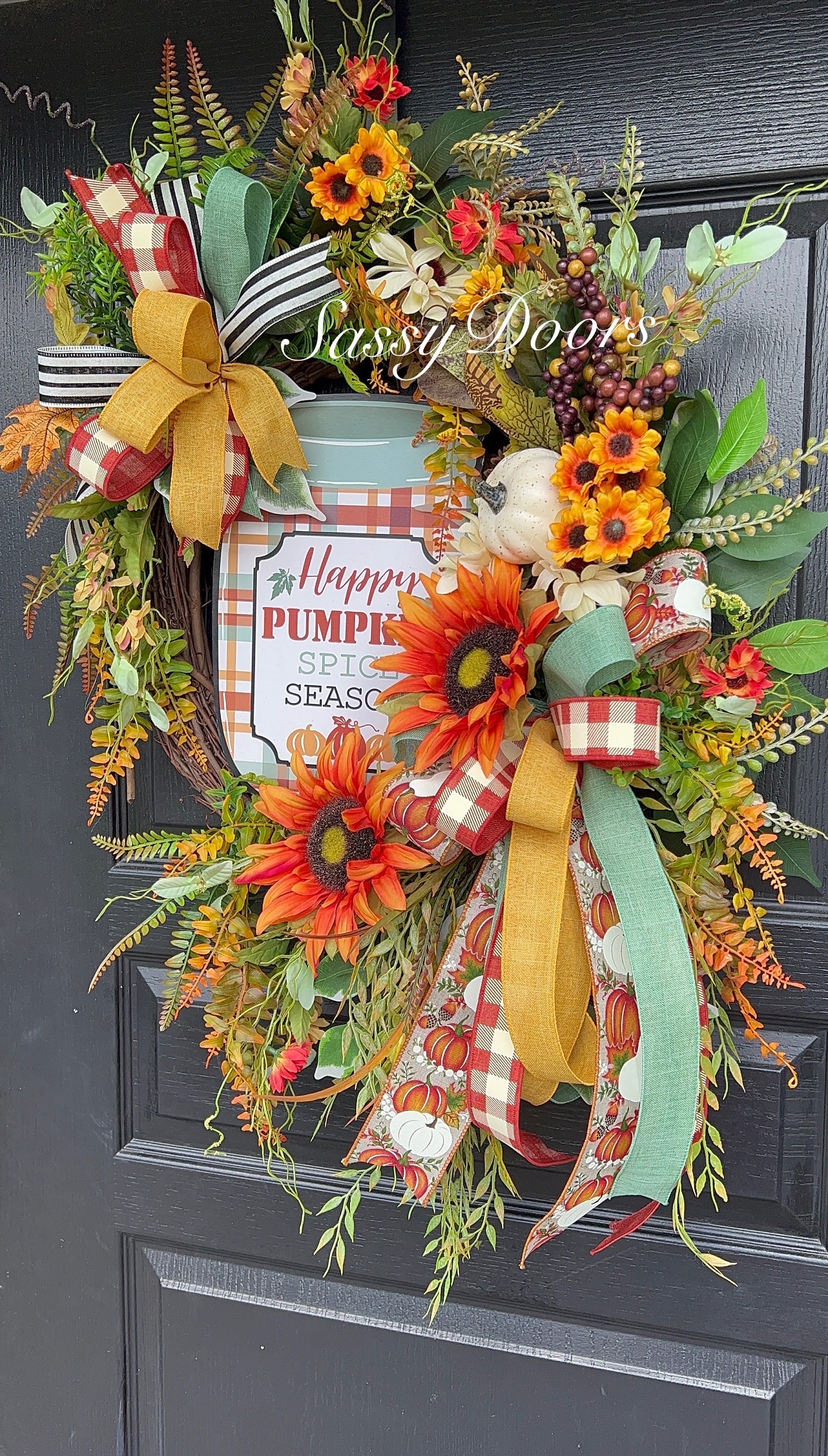 The variety of ribbons and bows of, soft green, pumpkin print, fall rust plaid and of course my favorite black and white stripe absolutely complete this unique design