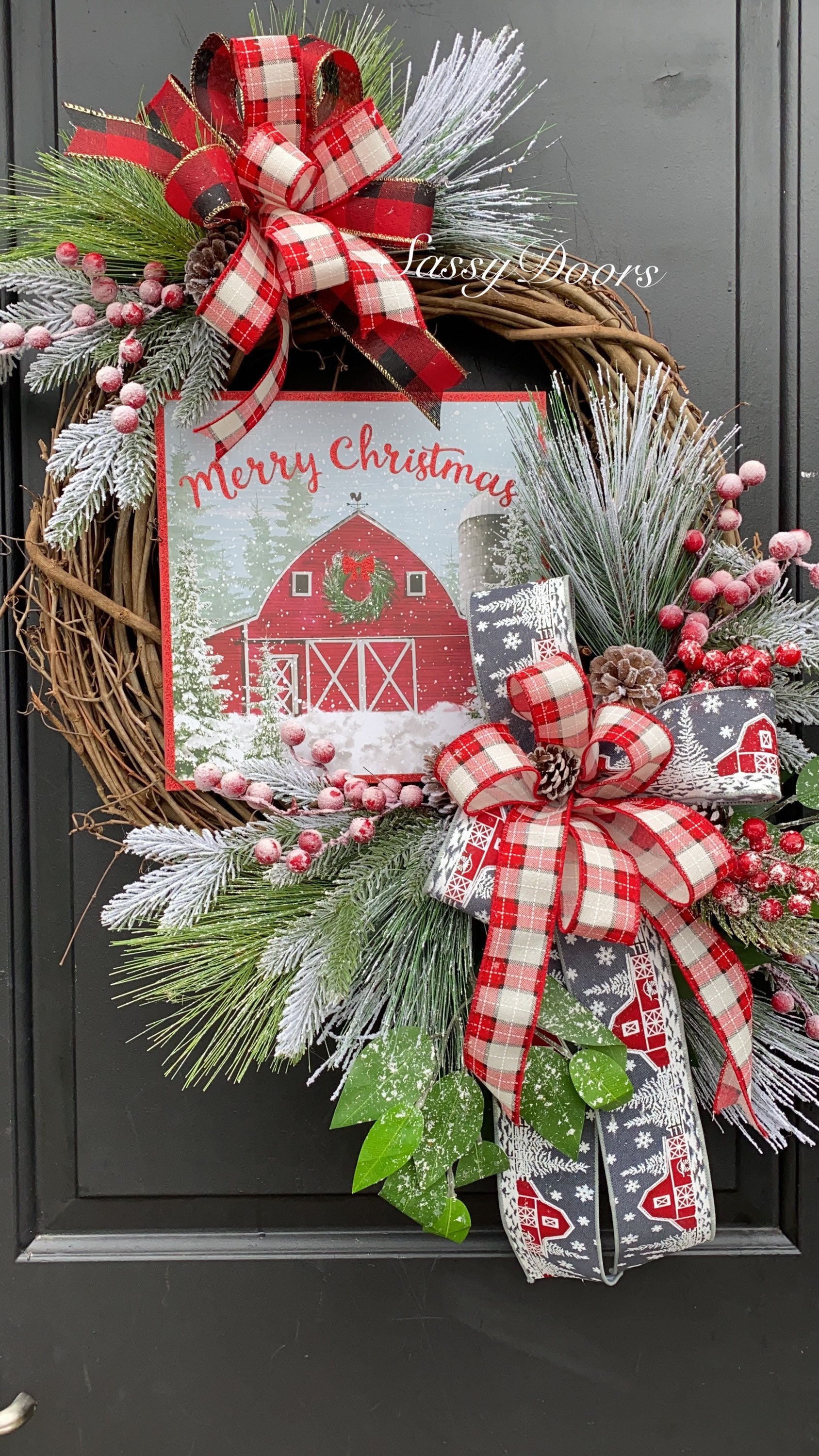 This XL Wreath is Designed on a 18”inch grapevine wreath. This awesome wreath is adorned with a charming farmhouse barn sign. Covered in snow pines and berries. The beautiful ribbons and bows of buffalo plaid and burlap add a warm farmhouse addition.