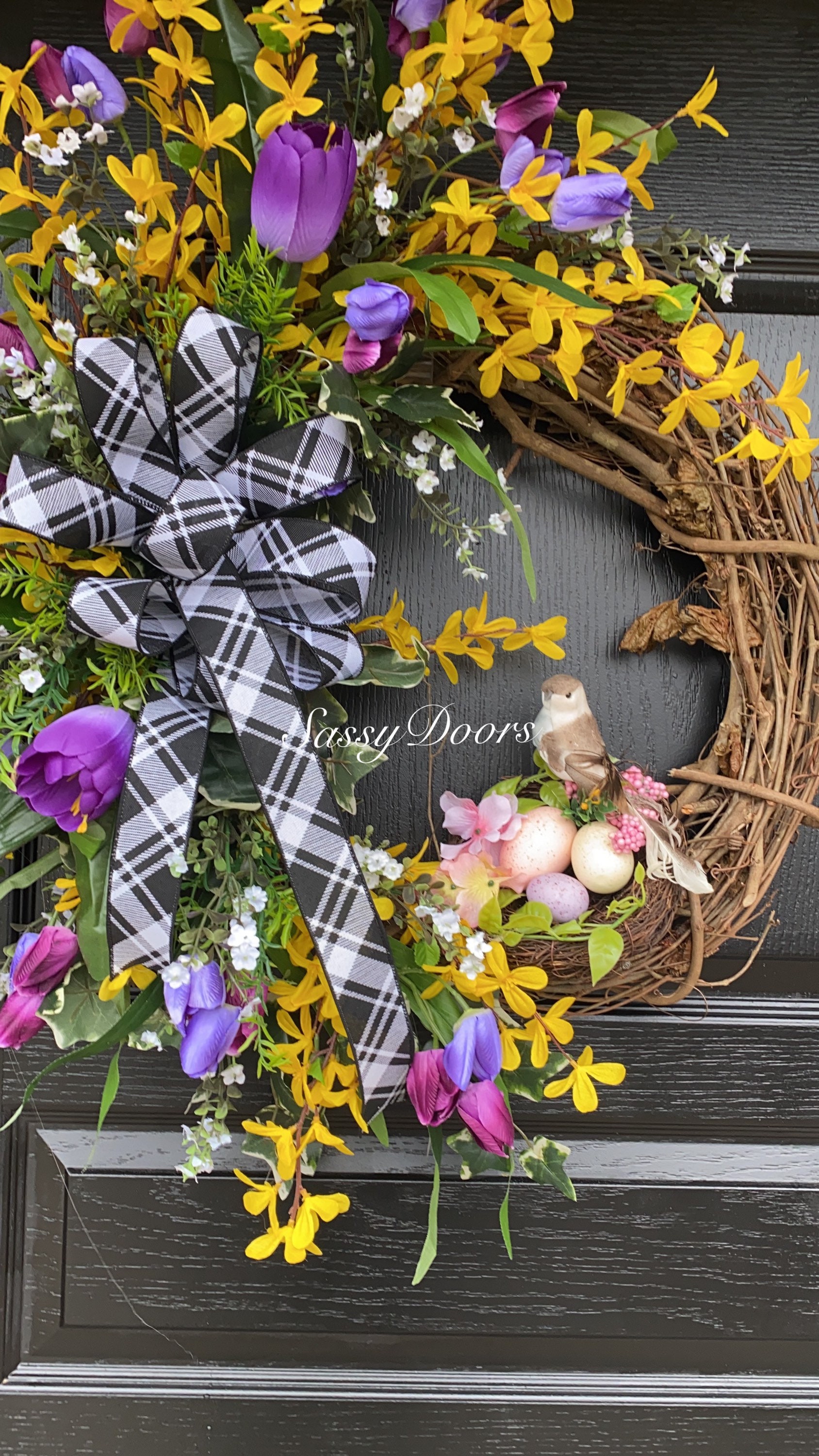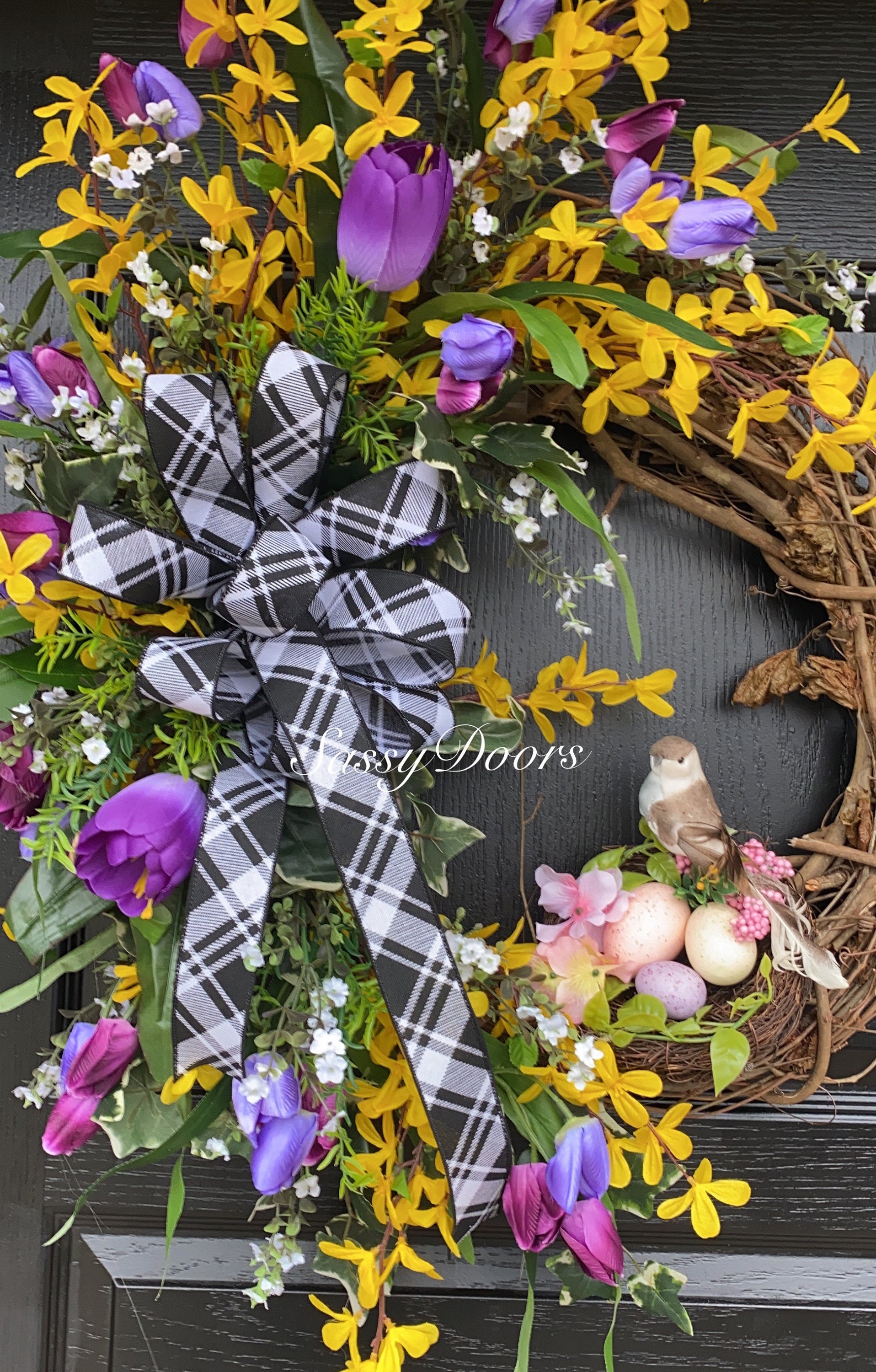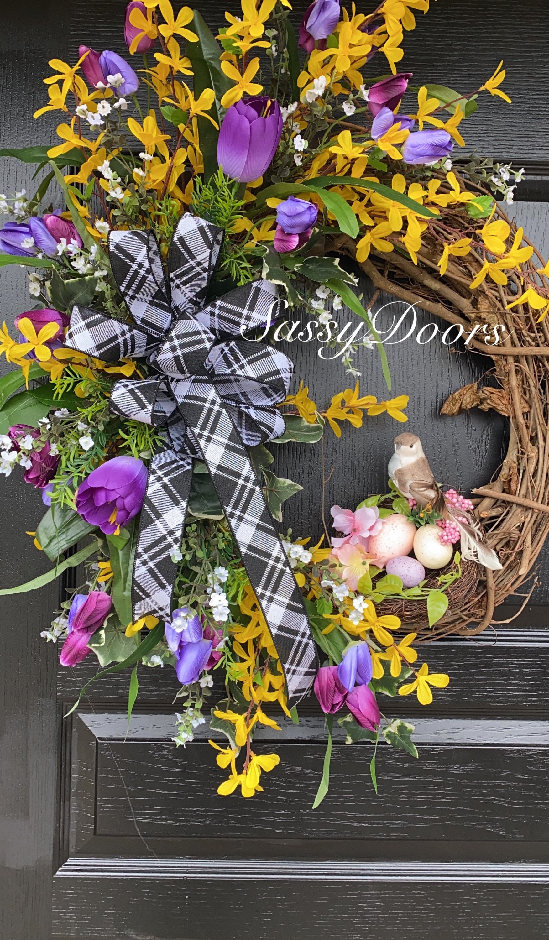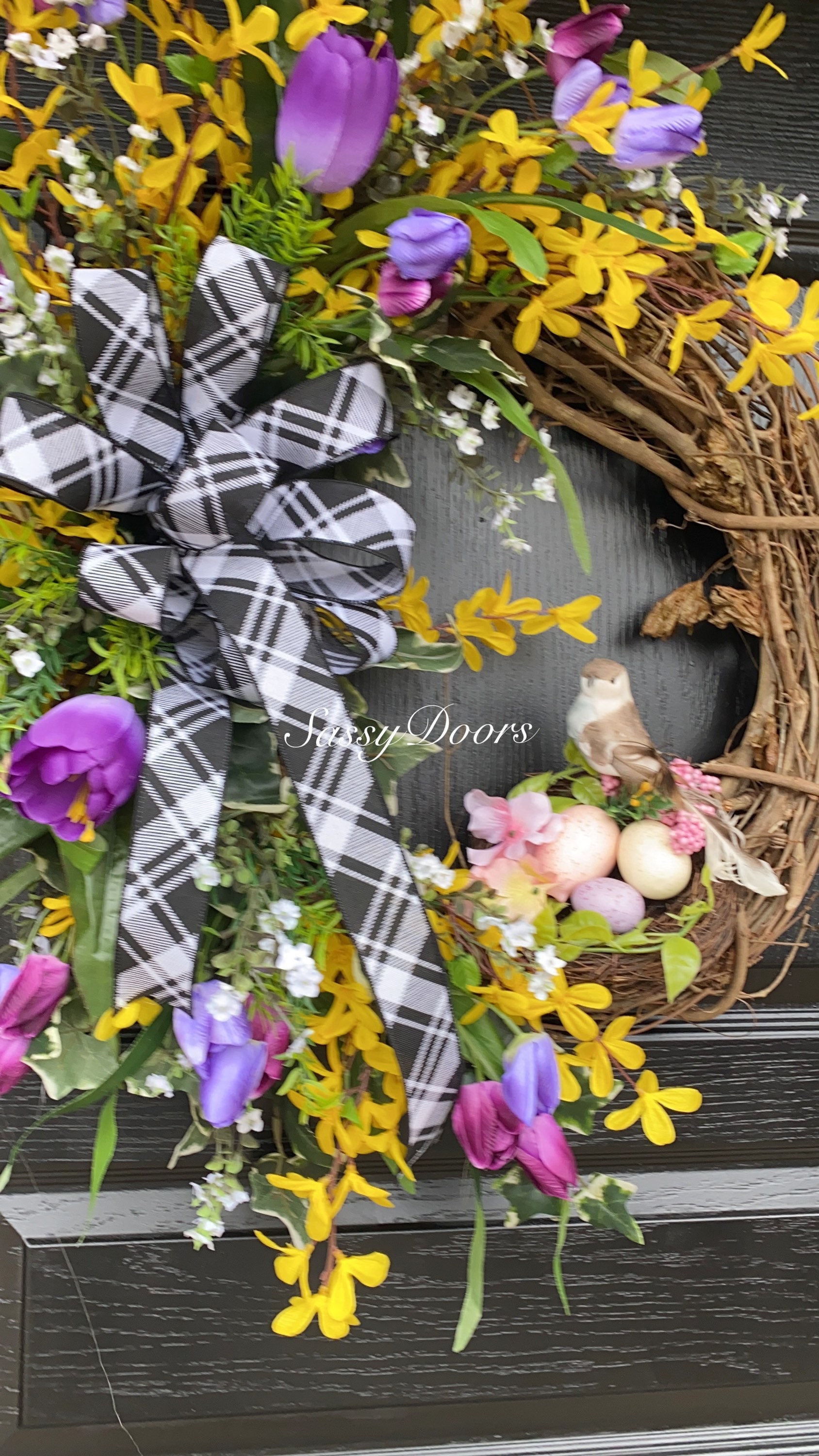 It is absolutely stunning is with it’s yellow forsythia and purple tulips that will make this pop off your door.