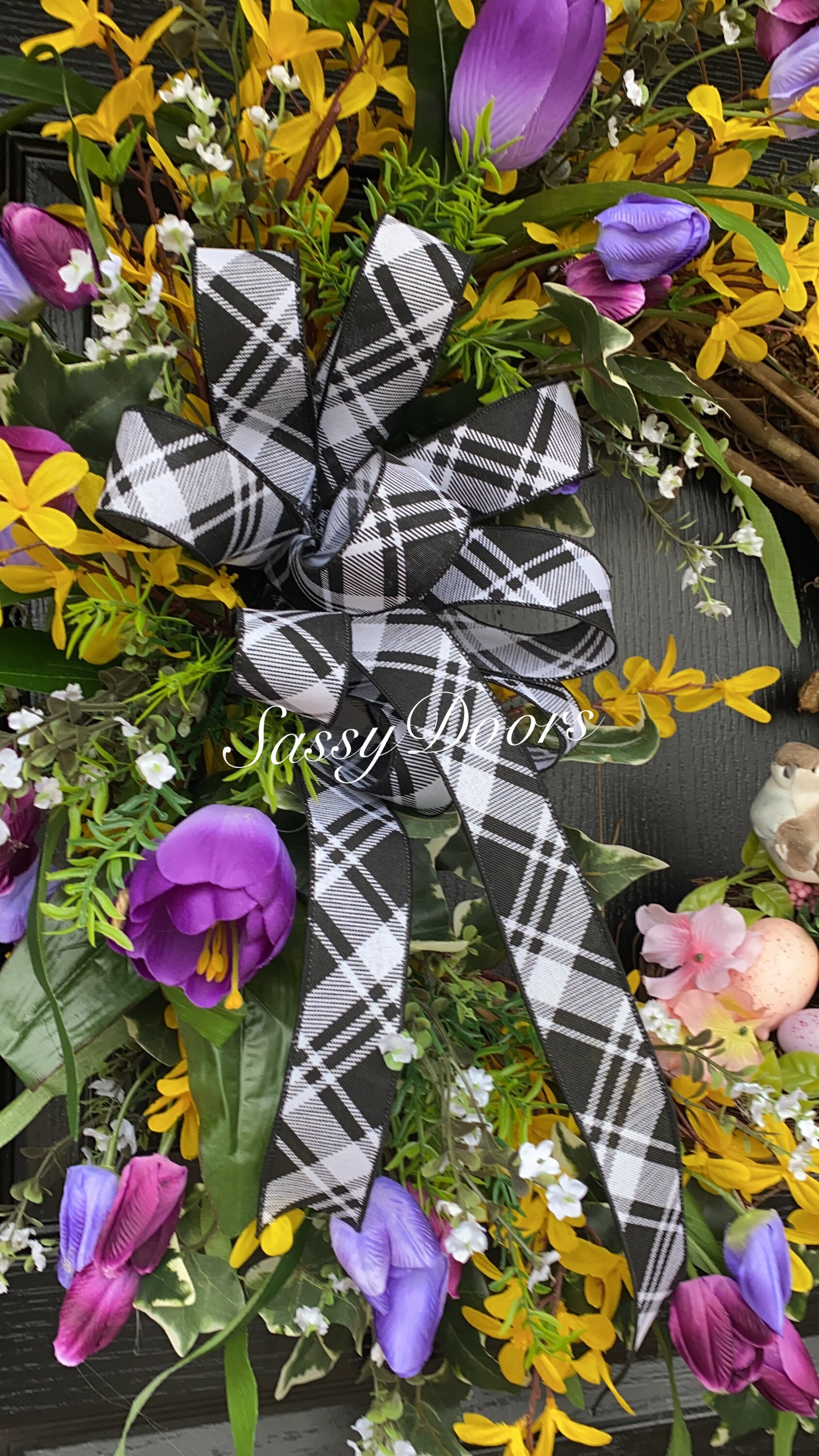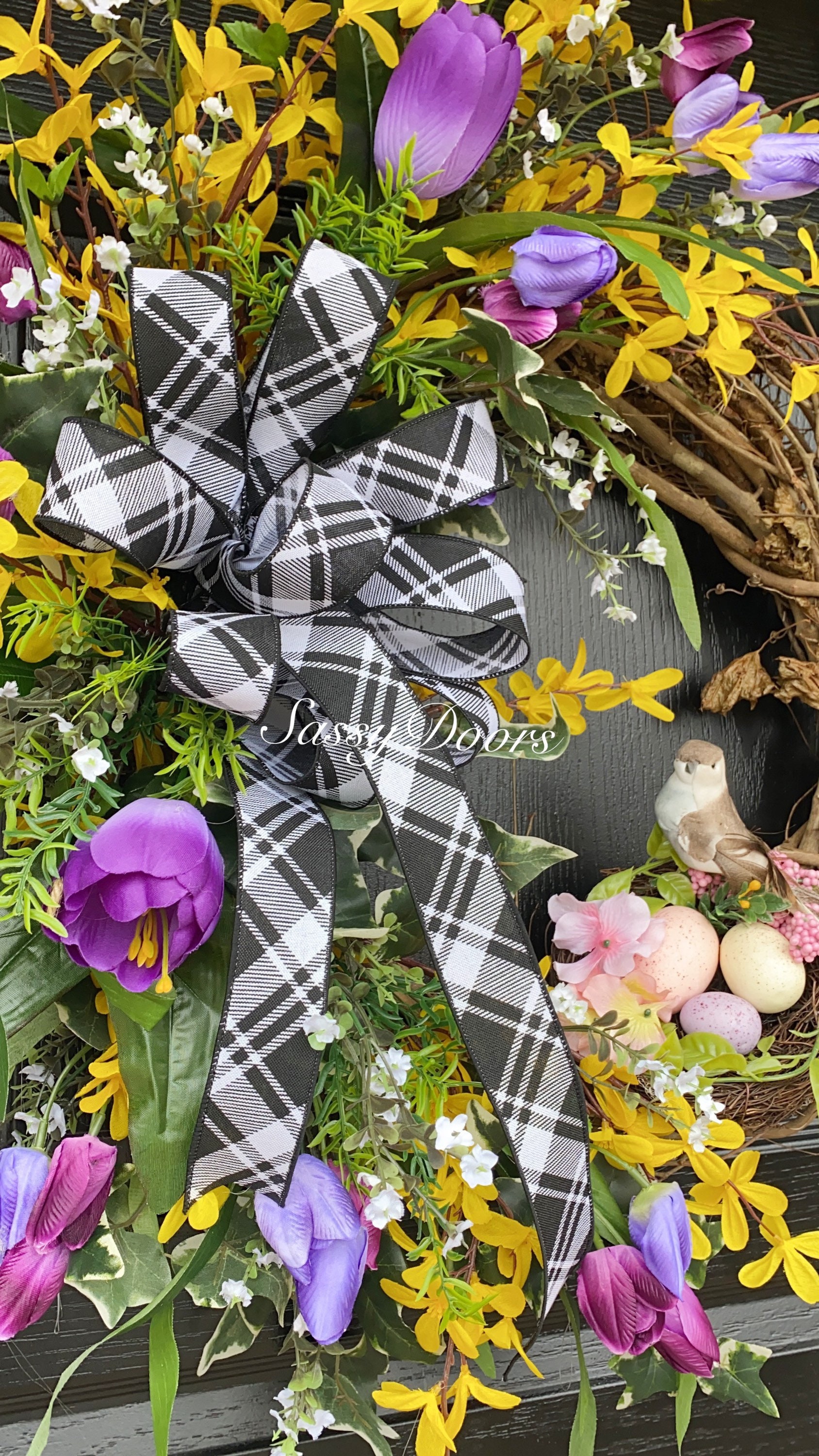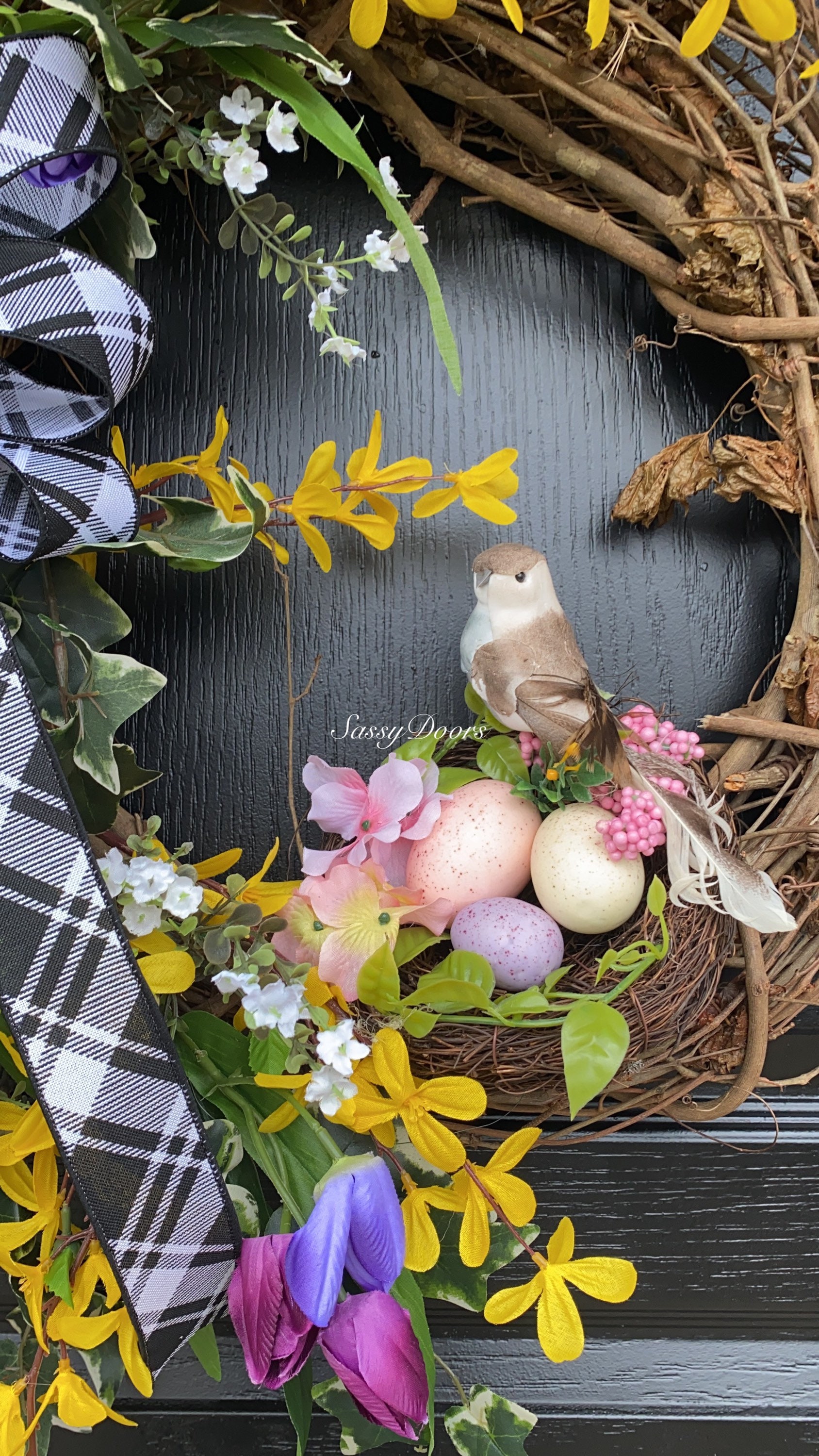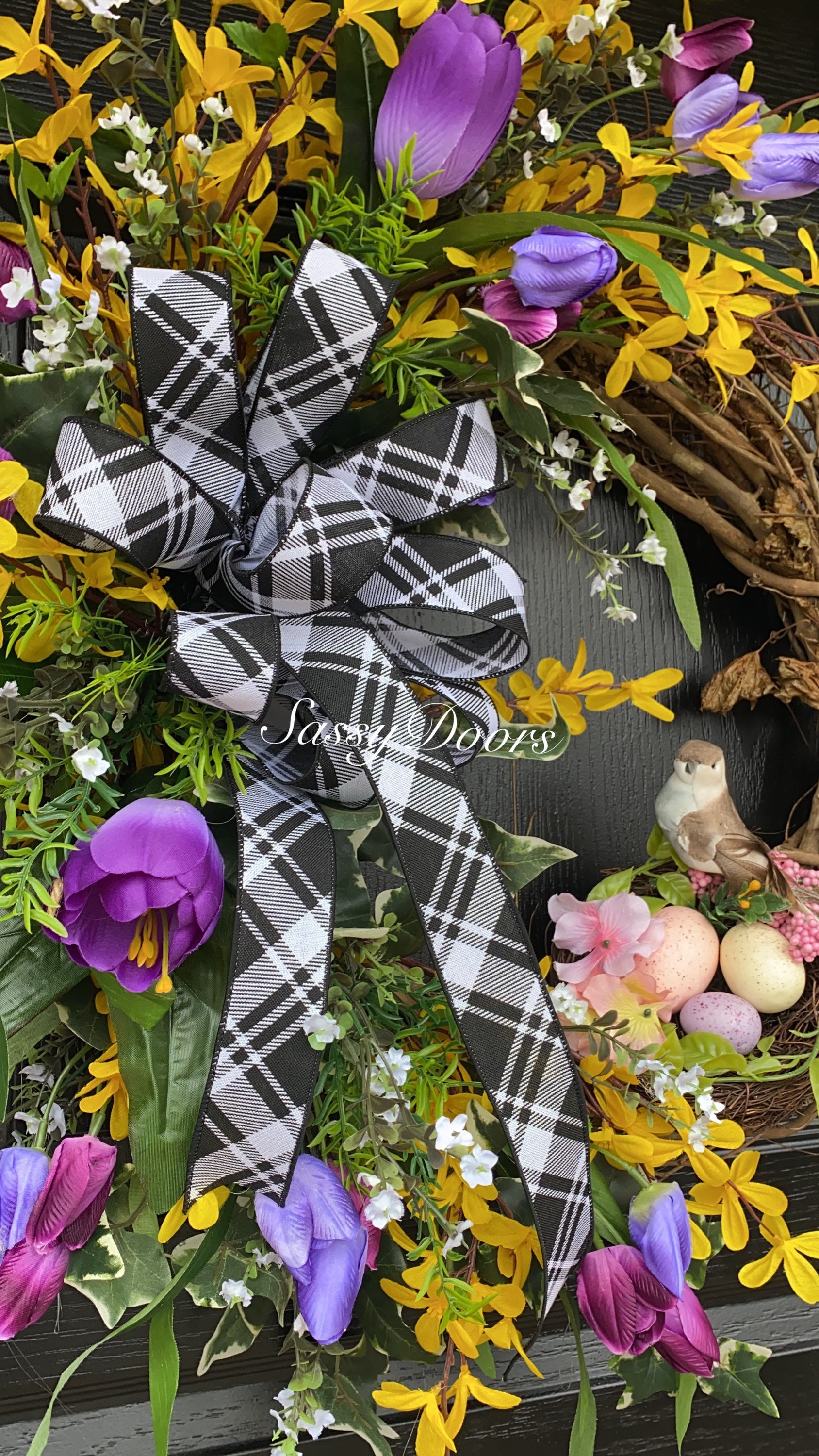 It is absolutely stunning is with it’s yellow forsythia and purple tulips that will make this pop off your door.