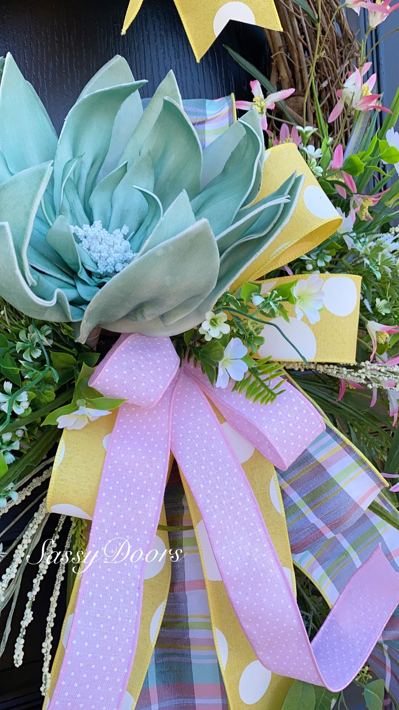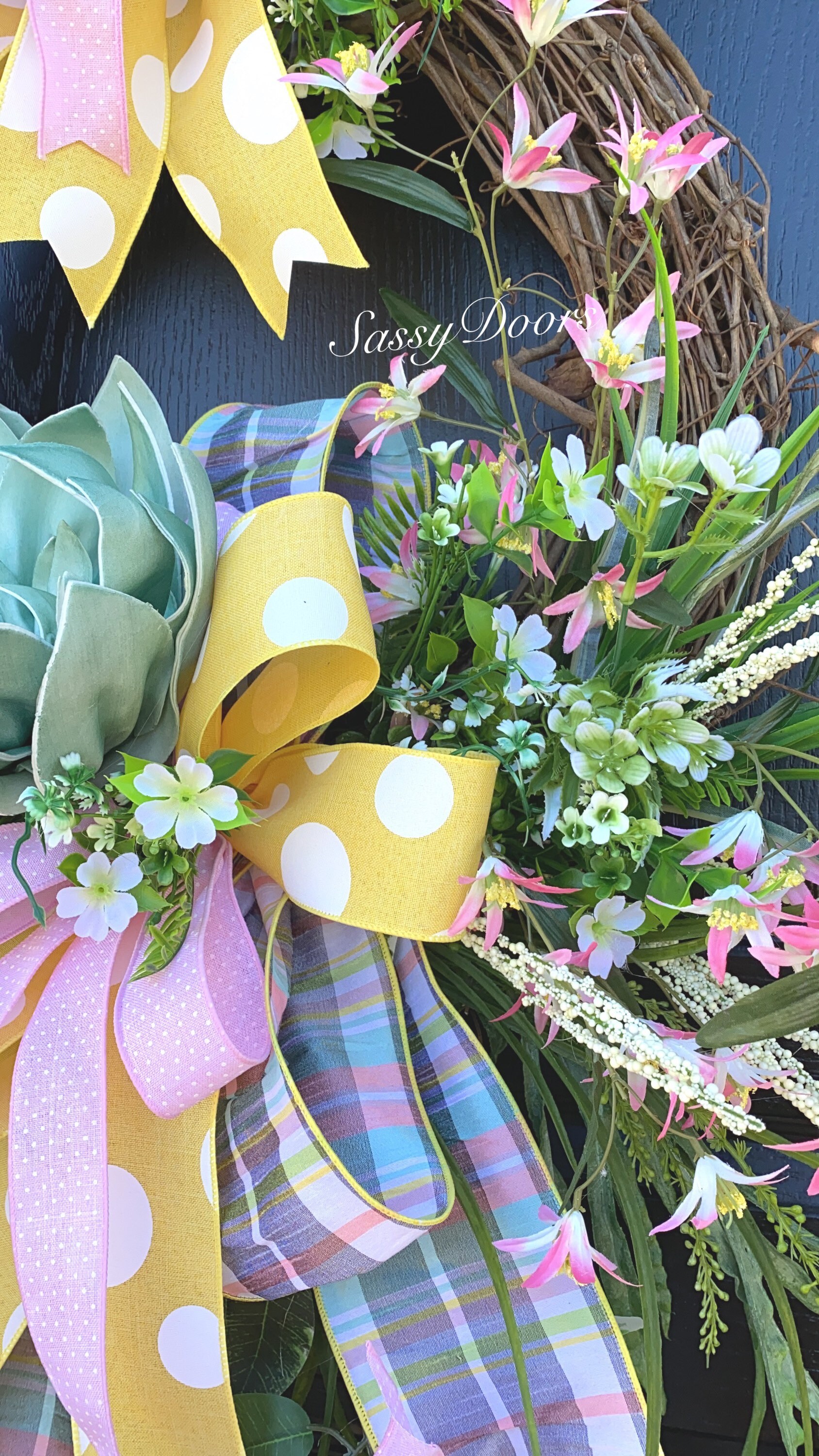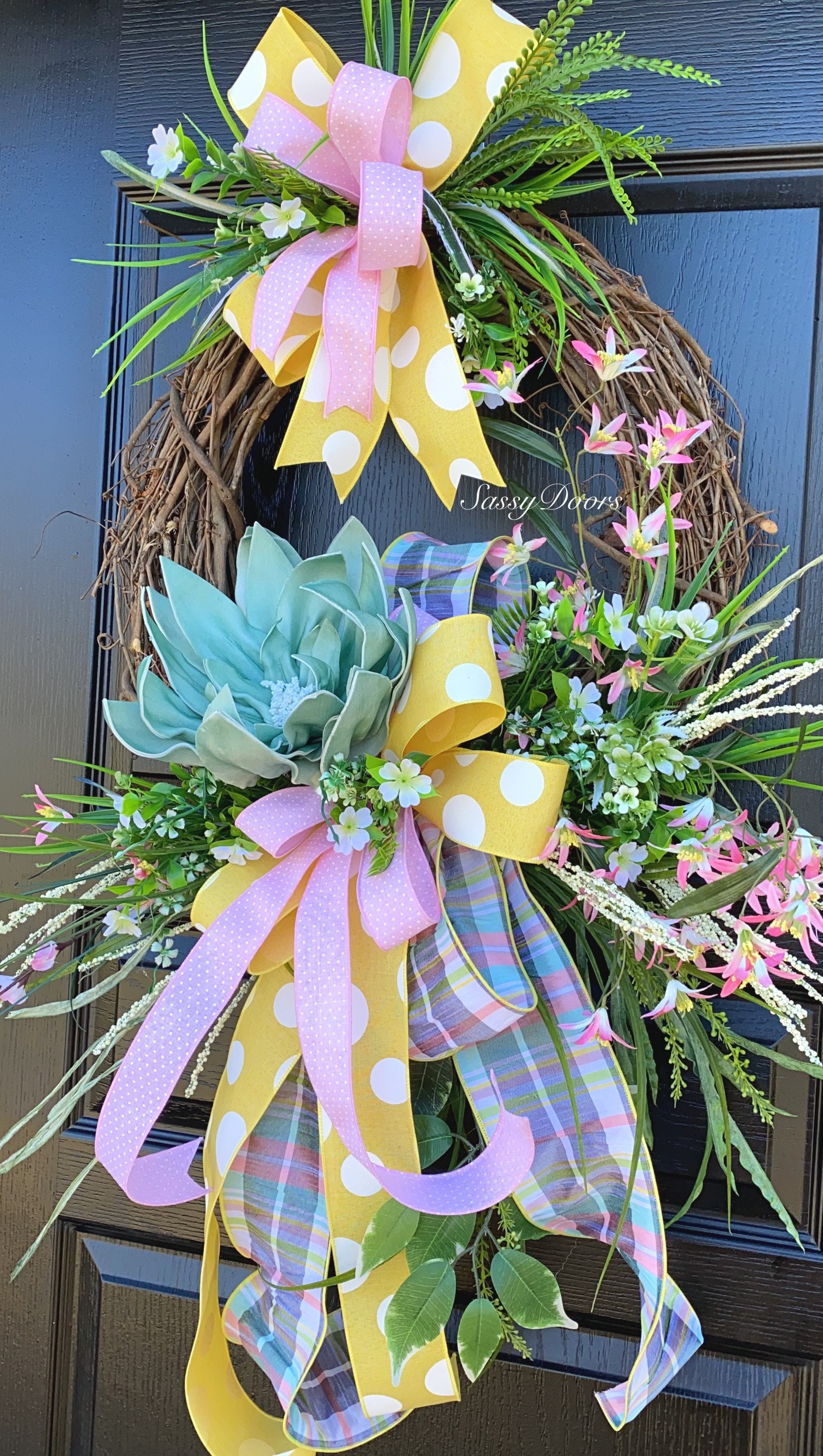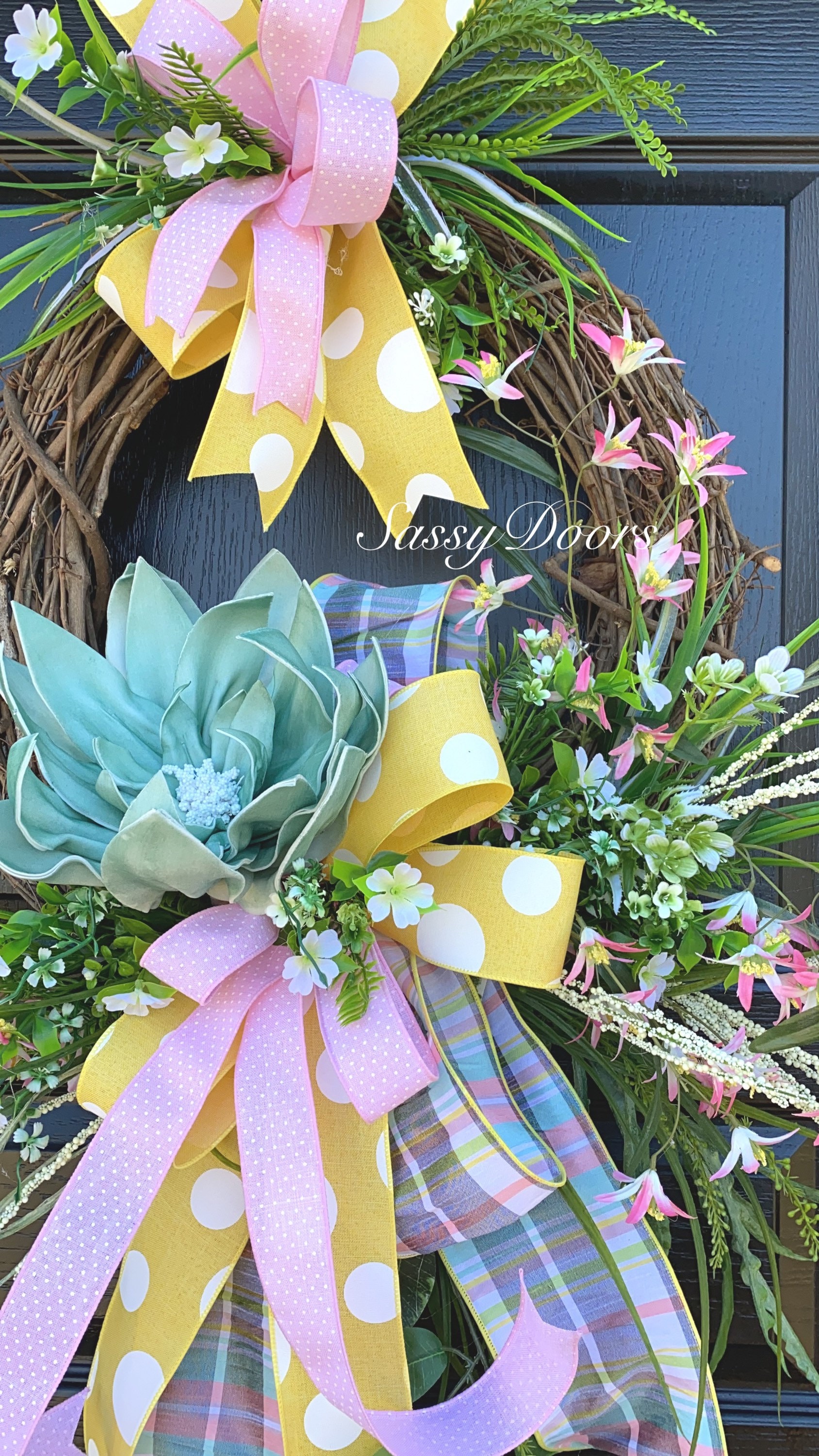 This beautiful wreath is designed on a 18" gravevine wreath and accented with multi ribbons and bows that are sure to make it pop on your door!