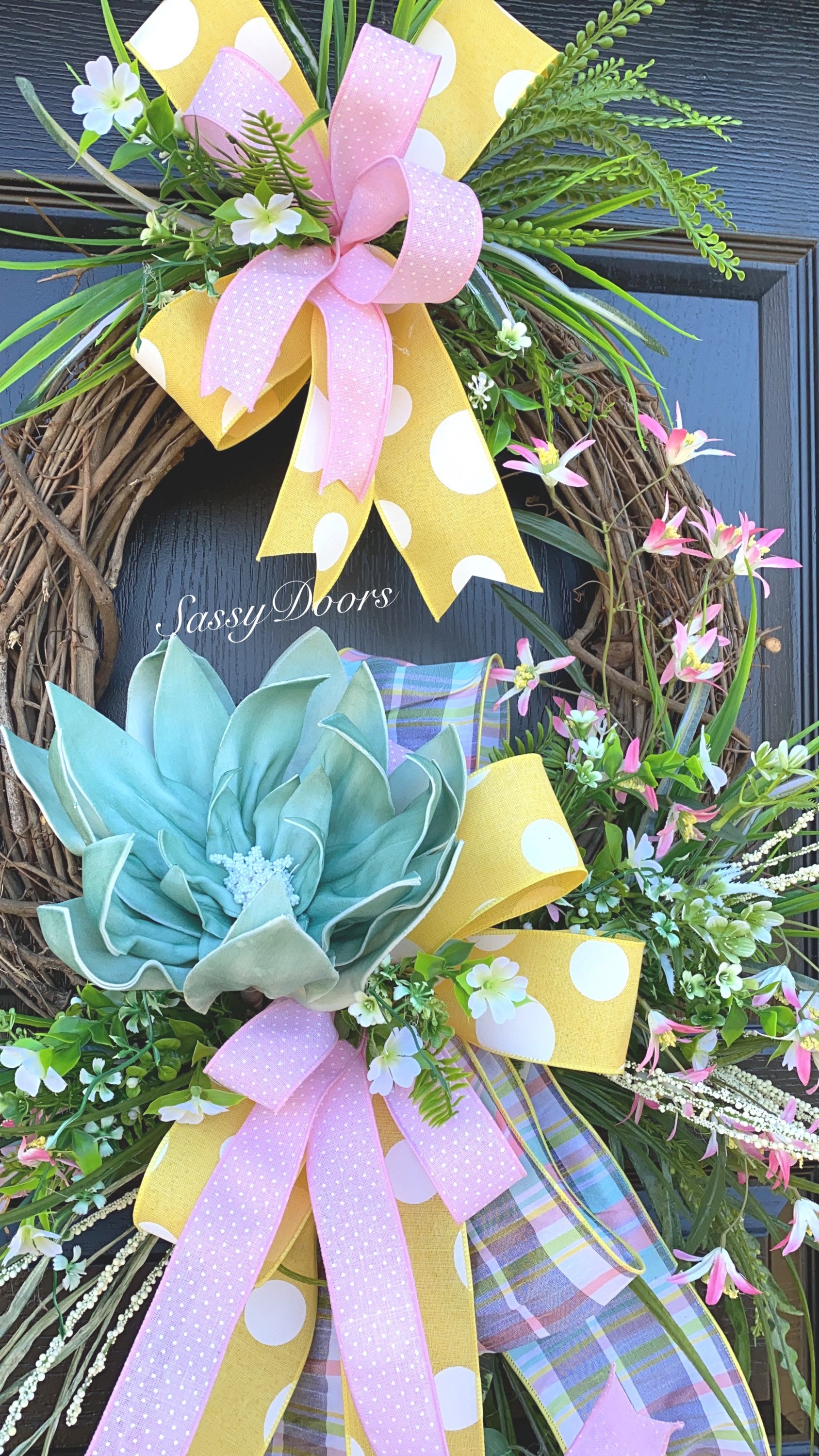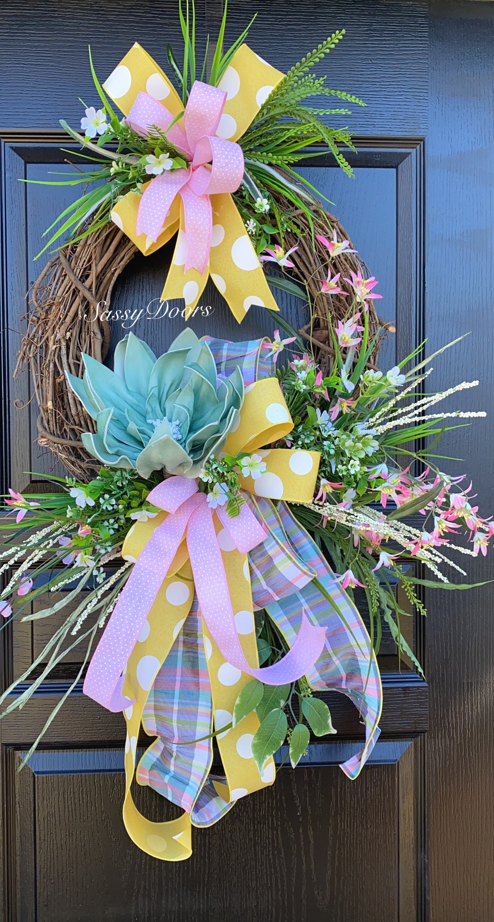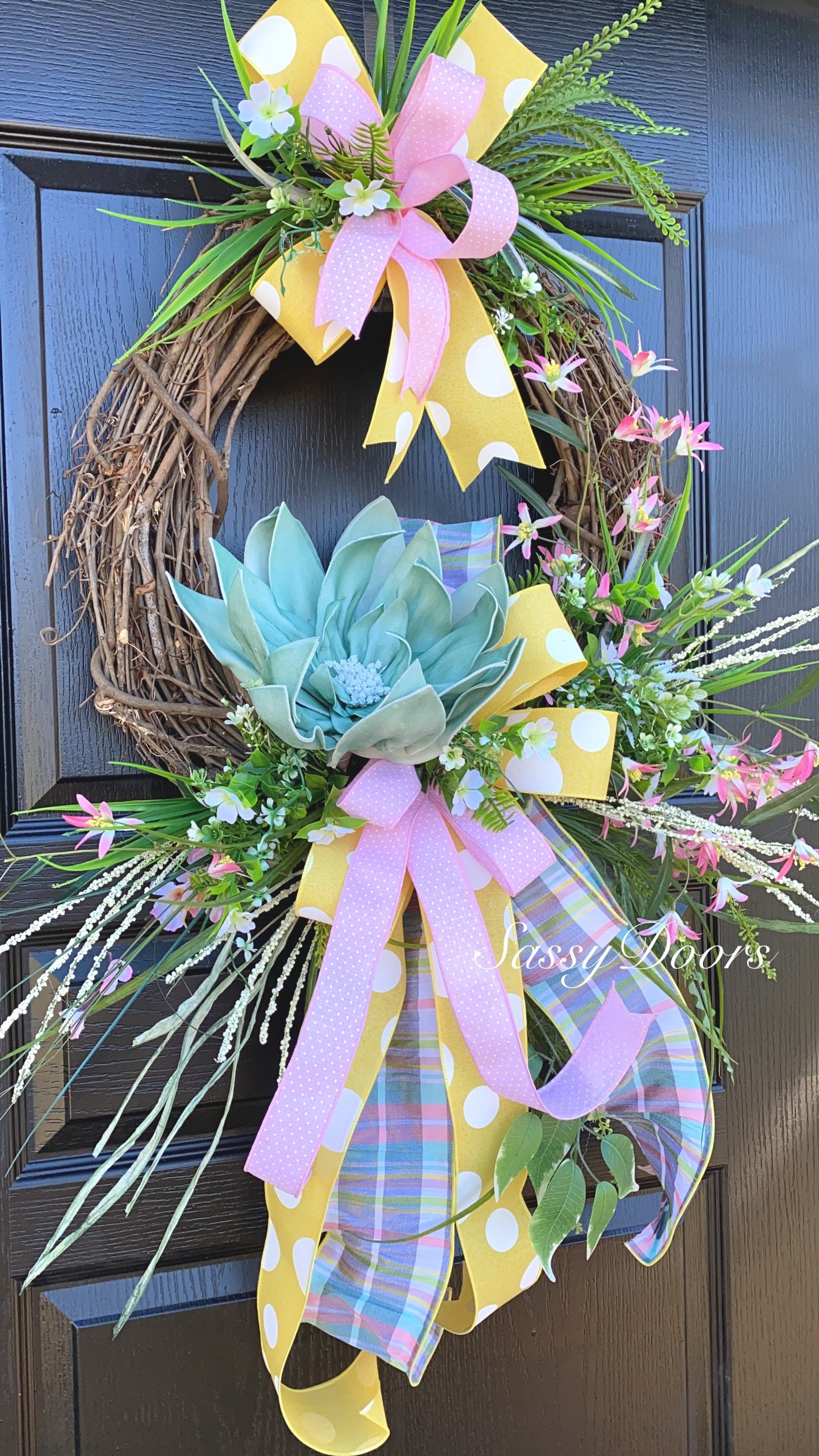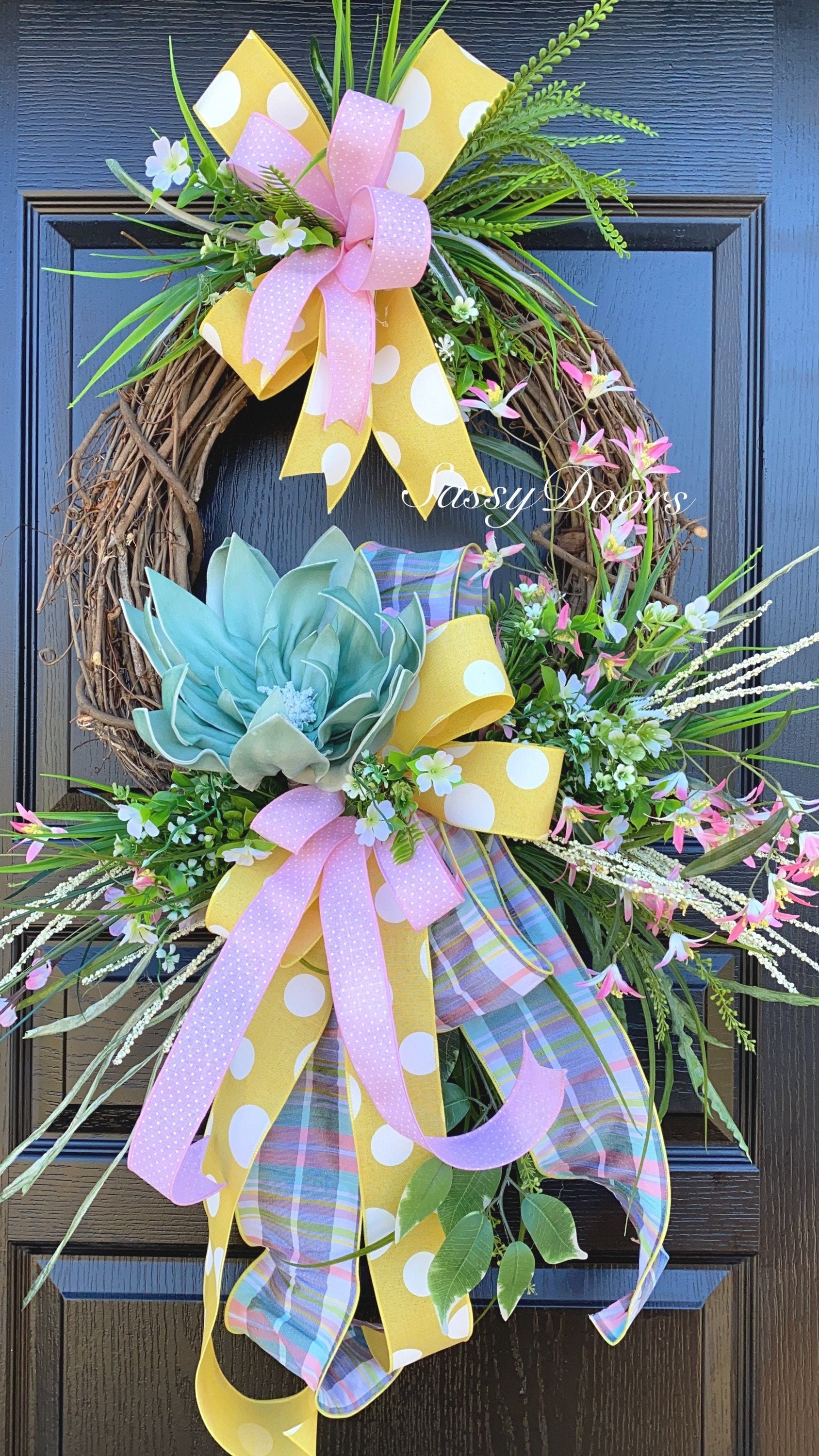 This beautiful wreath is designed on a 18" gravevine wreath and accented with multi ribbons and bows that are sure to make it pop on your door!