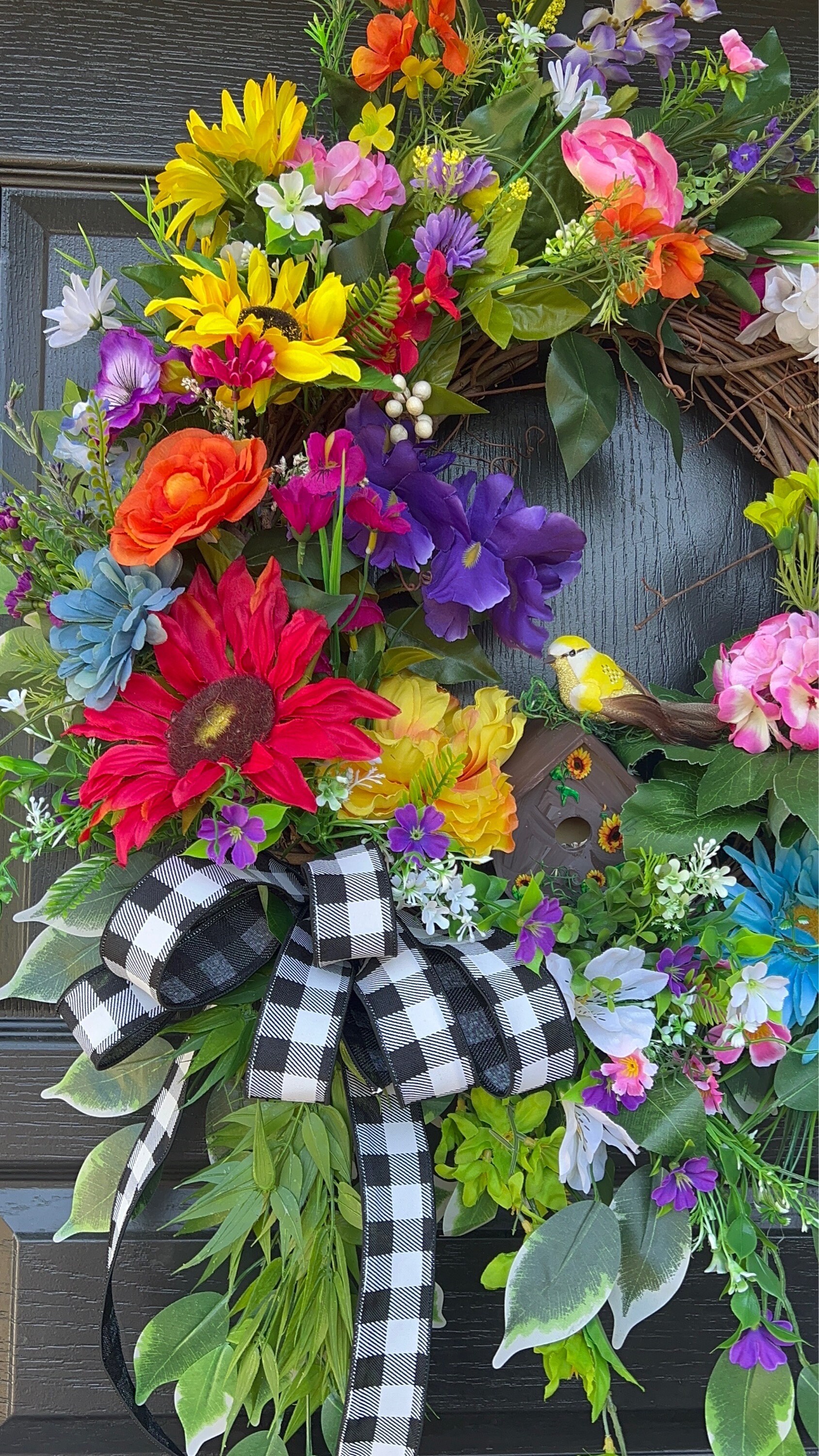 This lovely birdhouse grapevine wreath is designed with a variety of greenery and grasses along with a little bit of this and that!