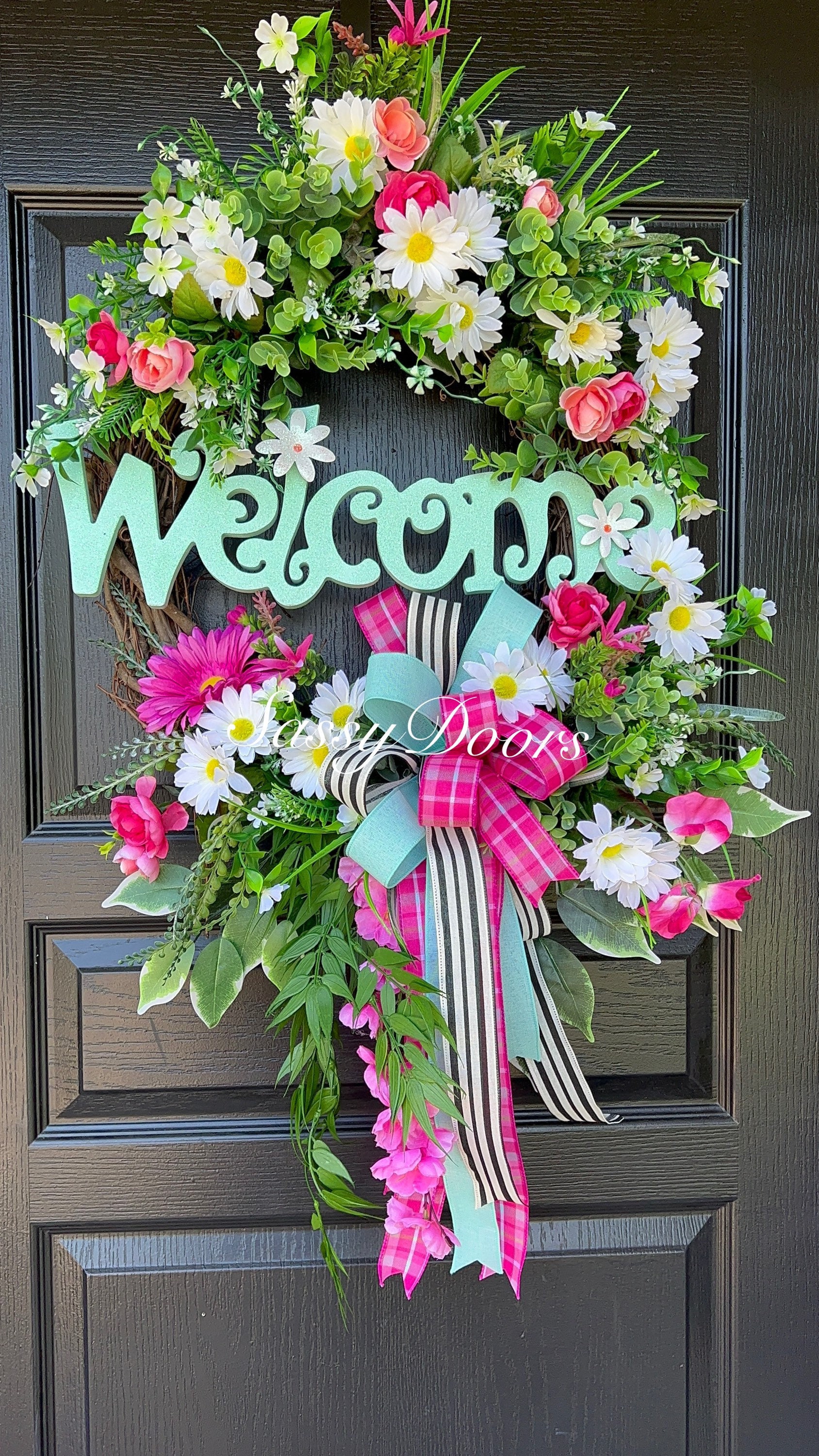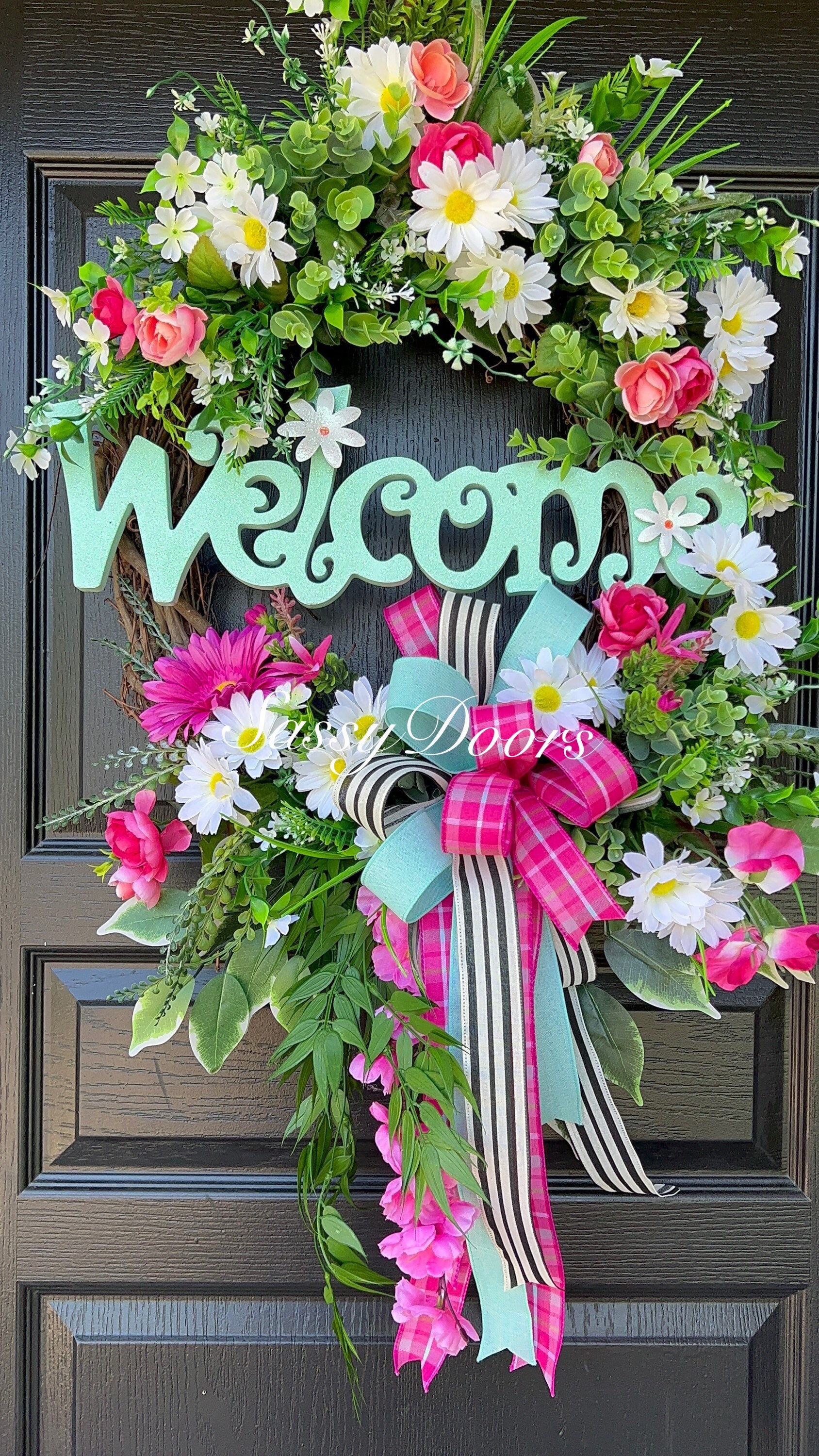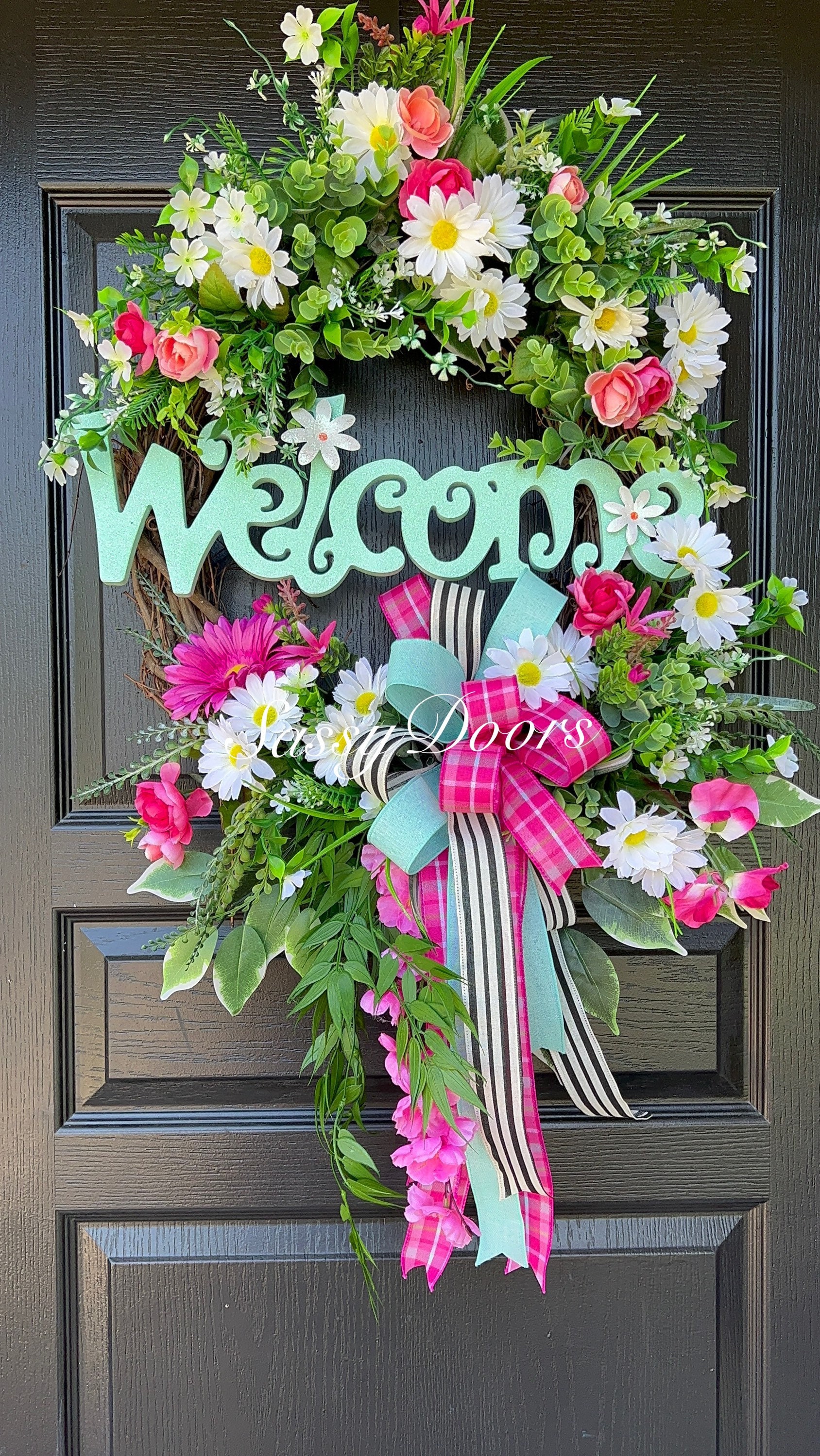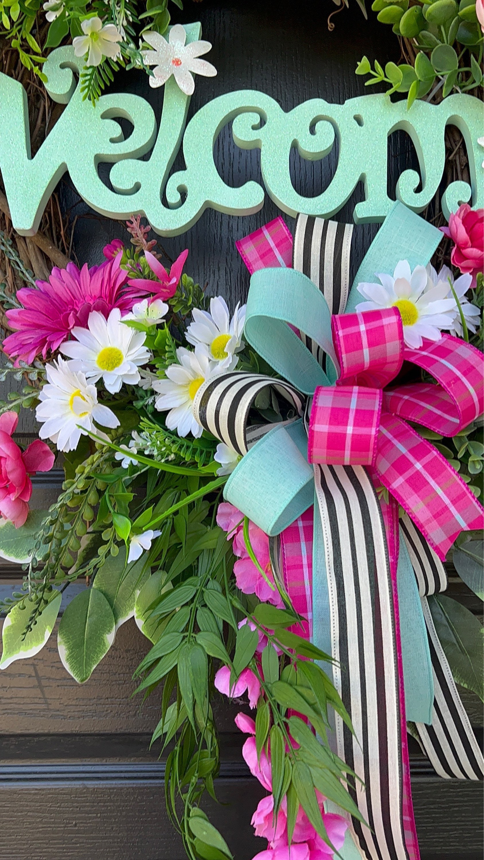 Designed on a 18” grapevine wreath Adorned with a blue glitter welcome sign along with beautiful pink, fuchsia and white flowers. The striking variety of ribbons and bows complete this summer design.