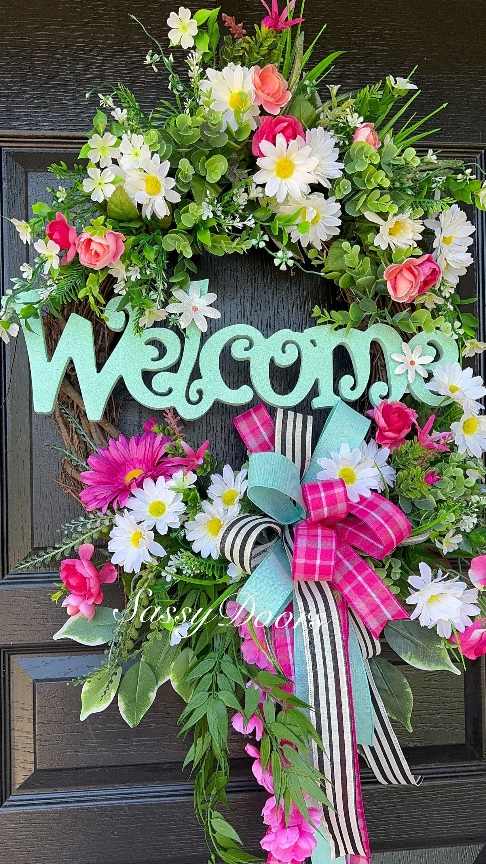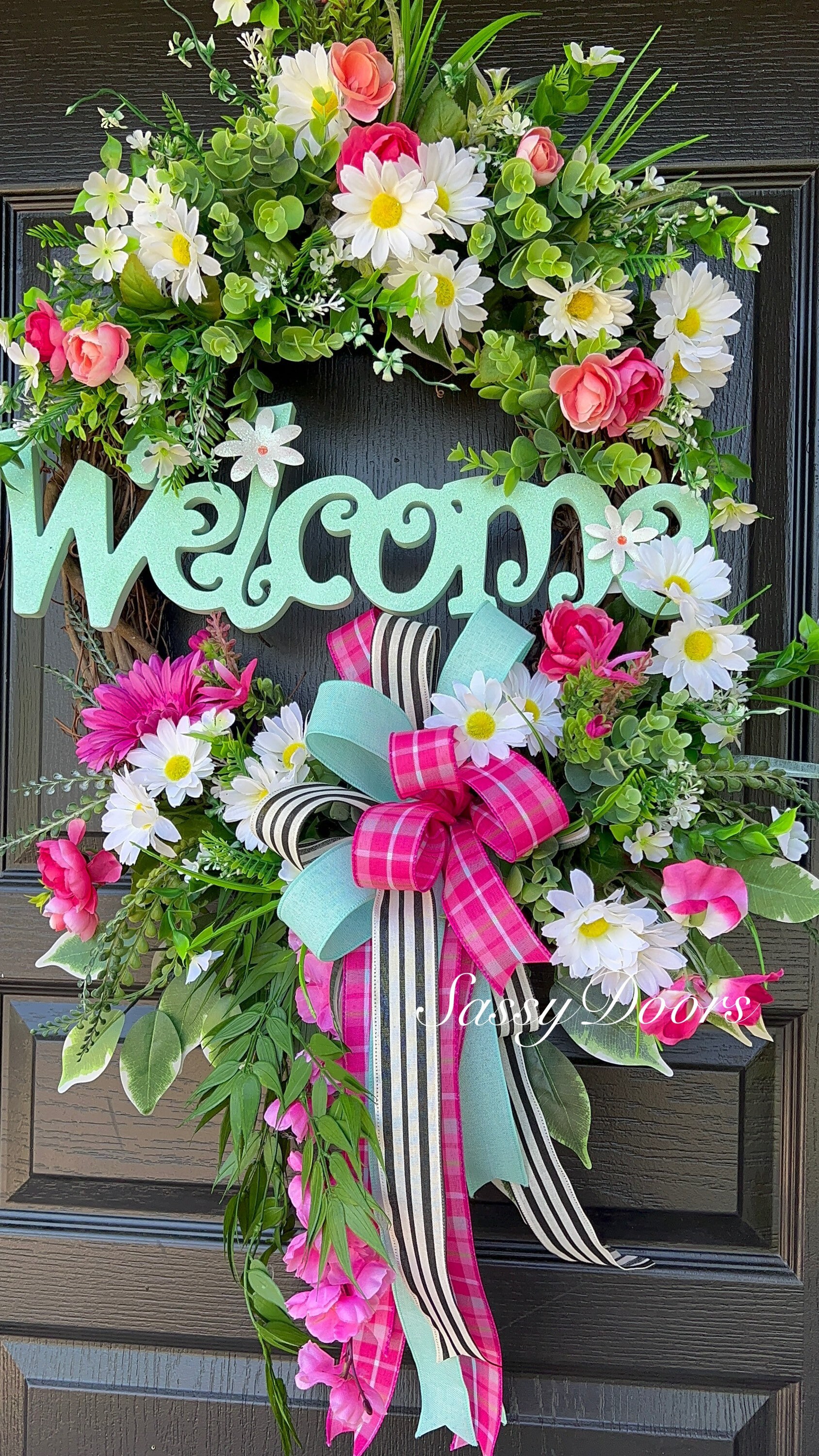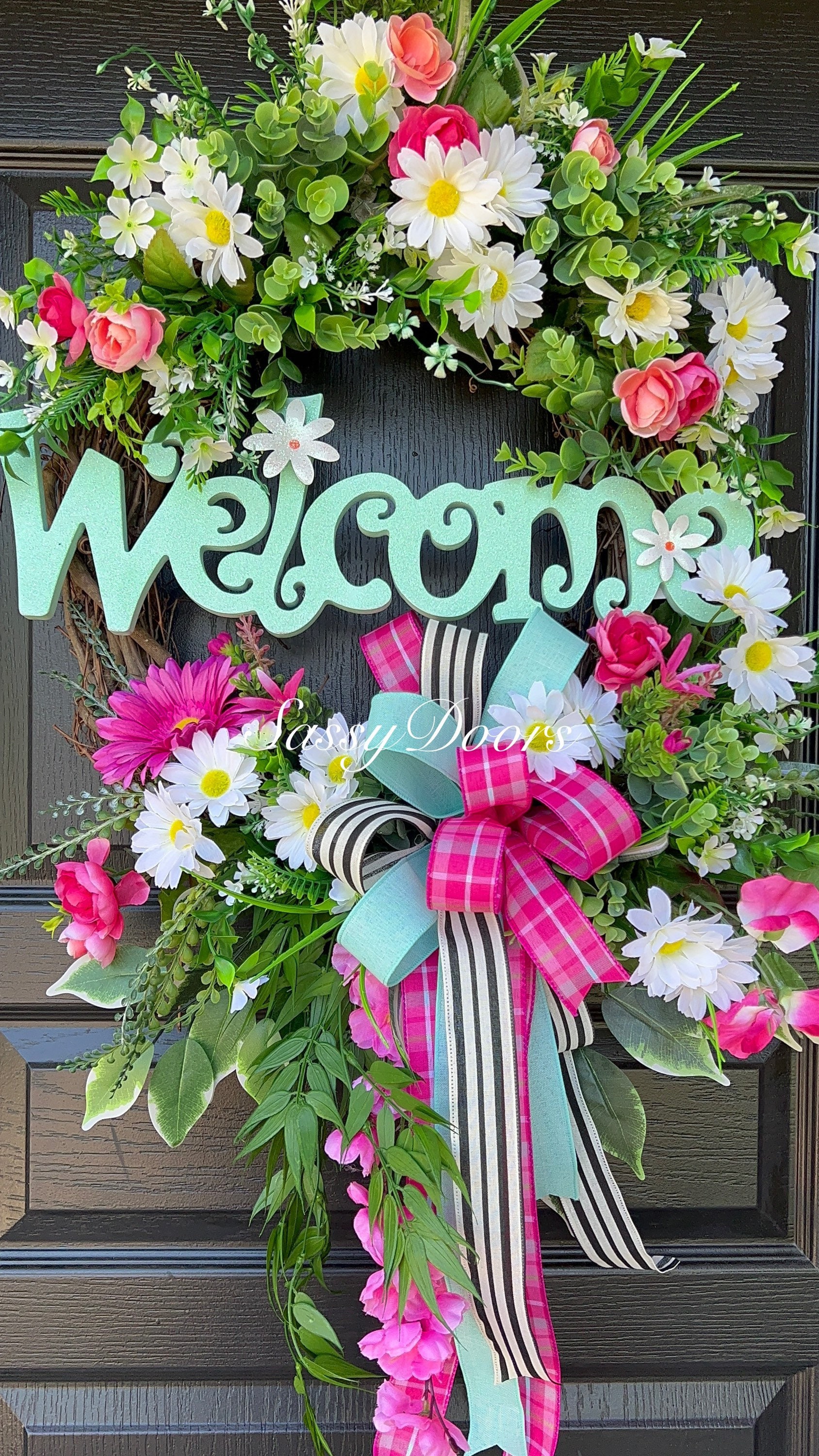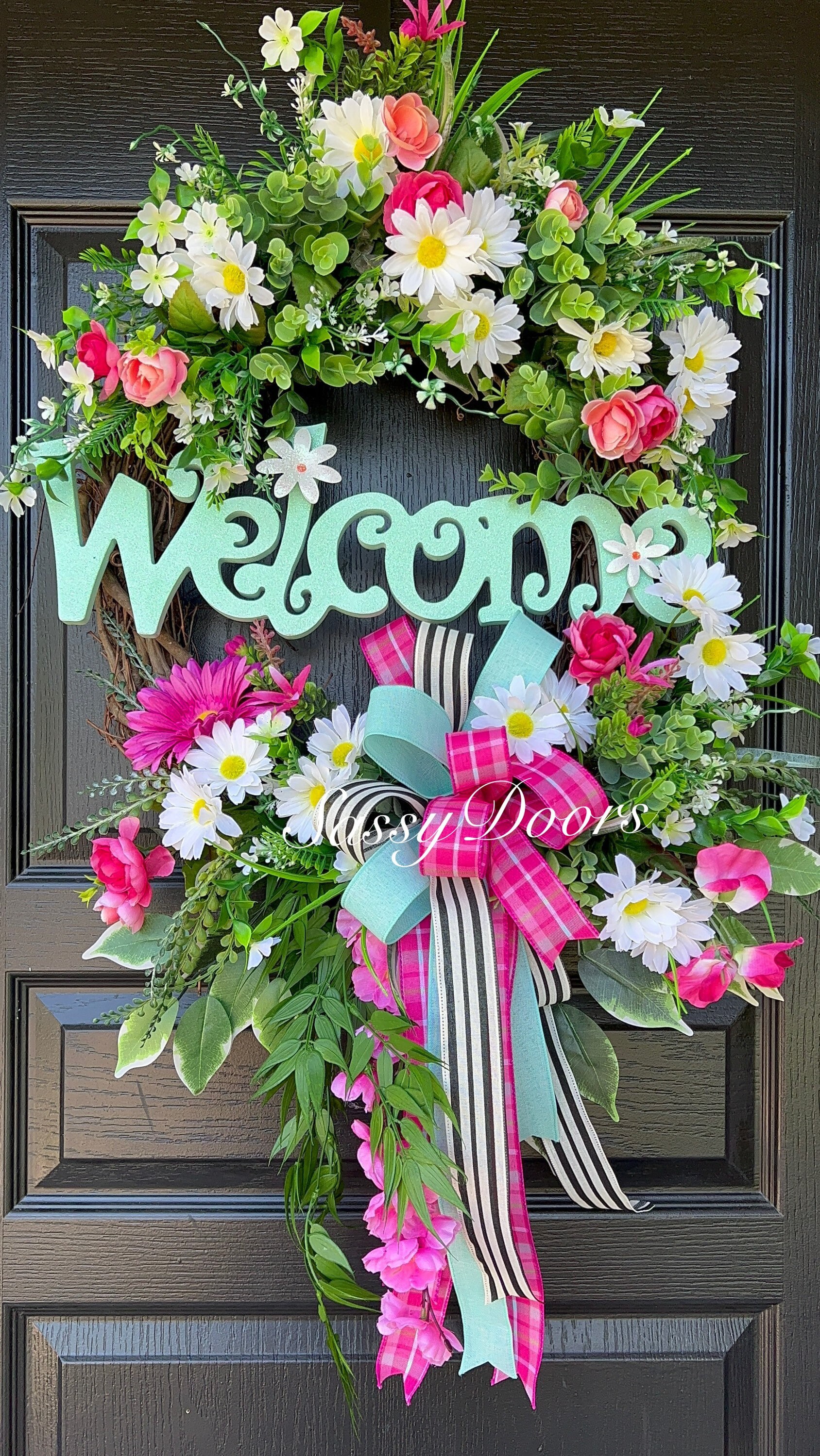 Designed on a 18” grapevine wreath Adorned with a blue glitter welcome sign along with beautiful pink, fuchsia and white flowers. The striking variety of ribbons and bows complete this summer design.